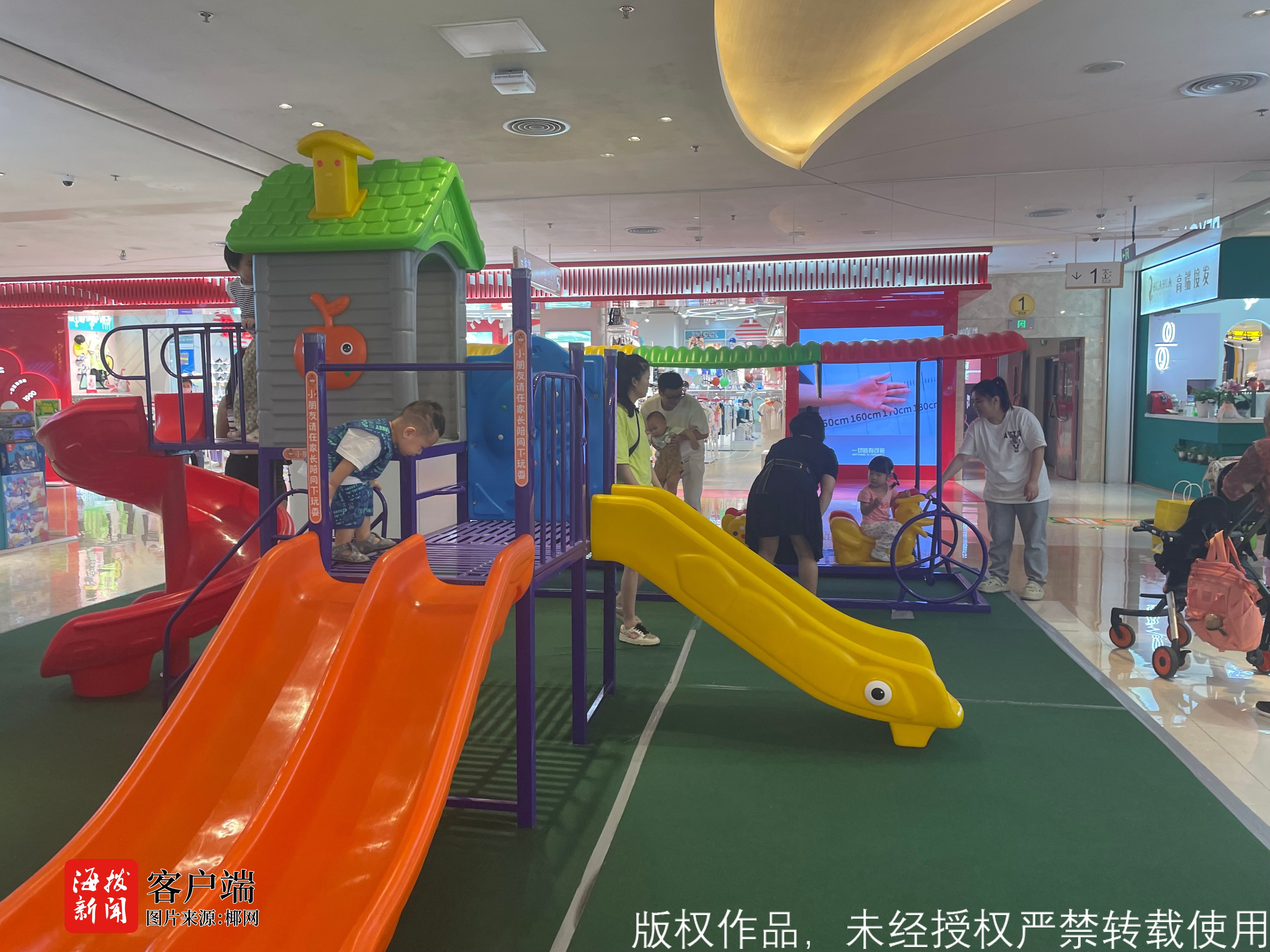 “天气太热,来商场遛娃也不错,不会中暑,还有那么多的小伙伴。”市民小林是一名新手妈妈,今天她带着三岁的女儿来到了这里玩滑梯,“氛围满满,到处是气球,有的销售员说买东西送气球,女儿听到后拉着我说也想要!”