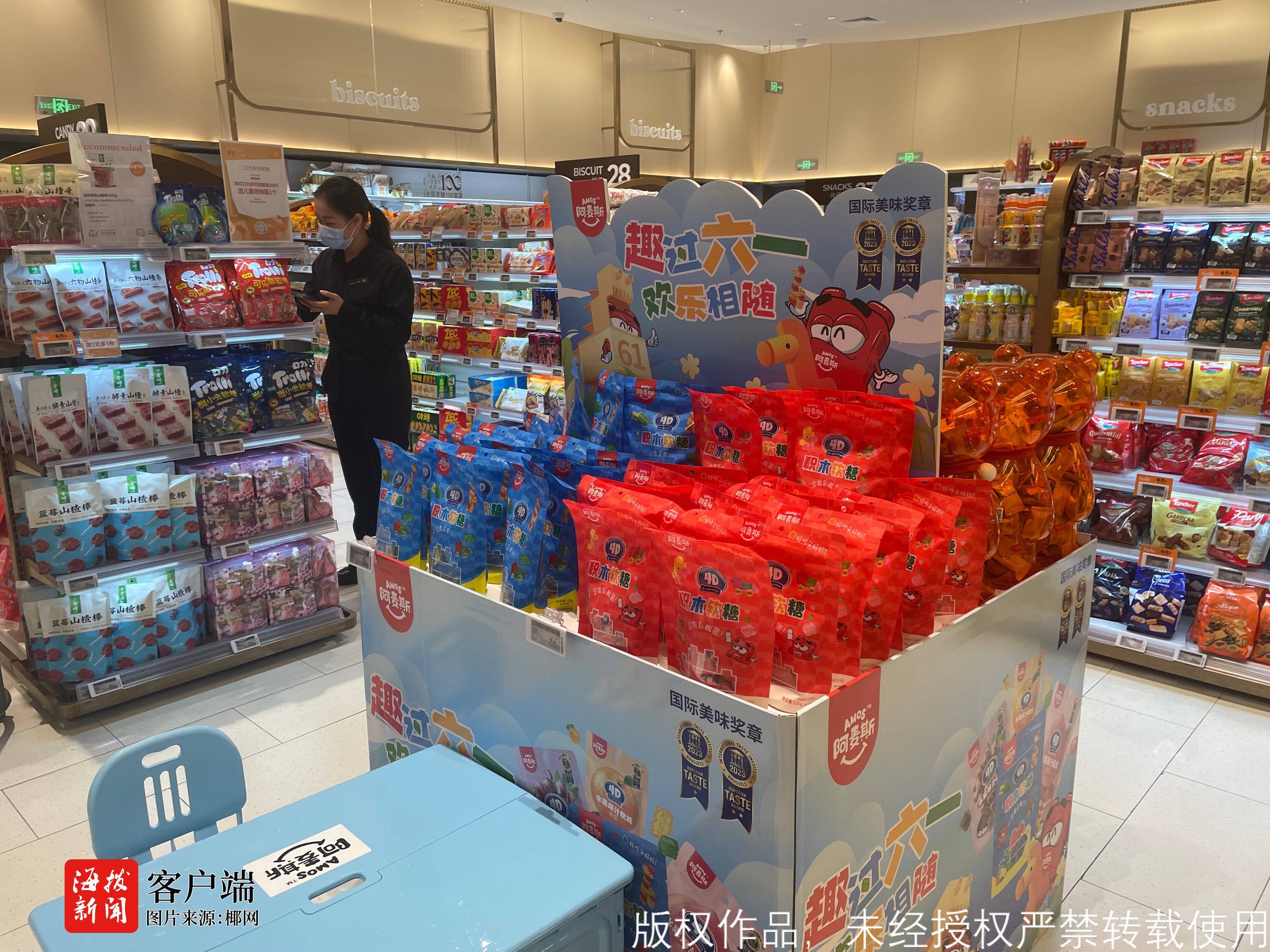记者在位于友谊阳光城的旺豪超市内看到,该超市推出了“无乐不作,盛宠六一”的主题活动,针对儿童用品、食品、玩具等方面进行了打折等促销优惠,并将儿童相关用品摆放至入口处的主过道中央的售卖区域上。