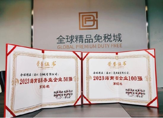 2023年12月,海南省企业联合会、海南省企业家协会以及海南省商业总会分别发布了2023年海南省企业100强和商业100强榜单,全球精品(海口)免税城有限公司再次上榜,荣获2023年海南省百强企业第62位,排名较去年上升16位;荣获海南省服务业企业50强第36位,排名较去年上升5位。