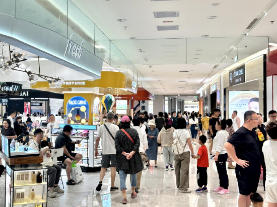 在三亚海旅免税城的中庭里,品牌快闪店以“龙”元素为主题的新春装饰十分喜庆,壮观的红色巨龙在云中穿梭,吸引游客纷纷逐步打卡拍照。各大品牌门店内,购物人群熙熙攘攘,收银台前大排长龙。