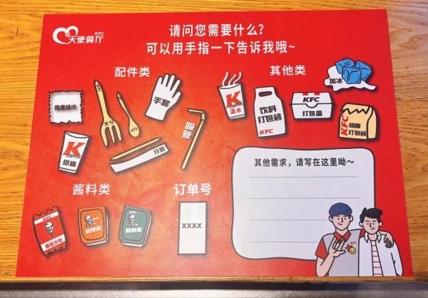 一位在餐厅用餐的消费者感慨道:“走进这家餐厅就觉得格外安静,原来真的可以不需要出声,一个手势就能让人觉得格外温暖。”为了提升听障员工的服务体验,今年餐厅全面升级了助残设施,包括手语菜单、手语沟通板等。