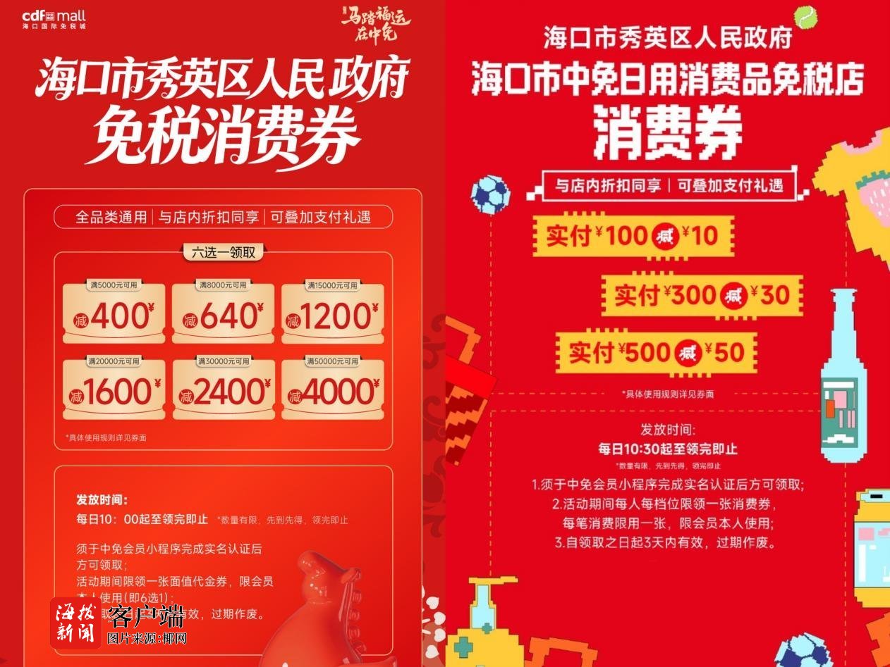 此外,2026年春节期间,免税城全品类推出满额立减、多倍积分、超值组包等多重让利,海口市秀英区也同步发放消费券,免税消费最高立减4000元,新开业的海口市中免日用消费品免税店也发放专属消费券,三档面额即领即用,进一步激发岛民进店热情。