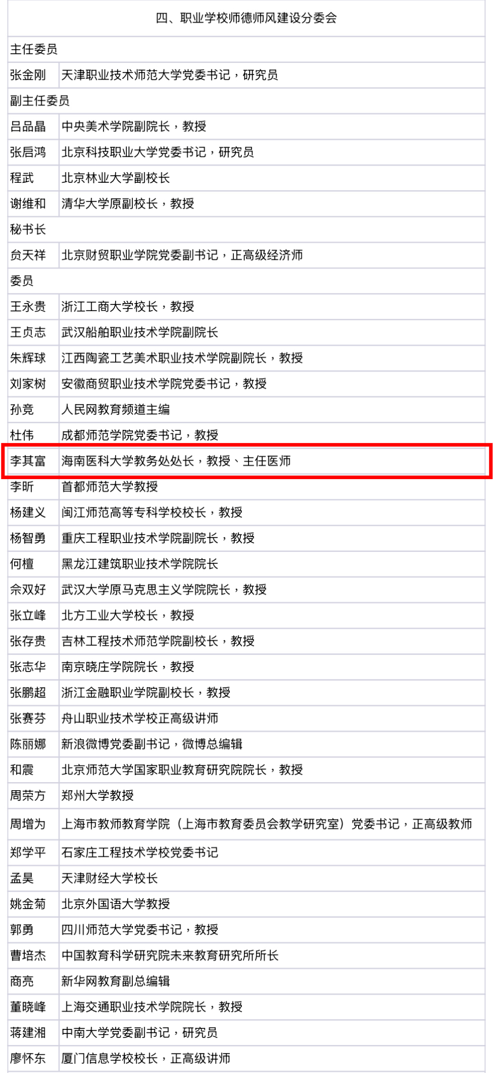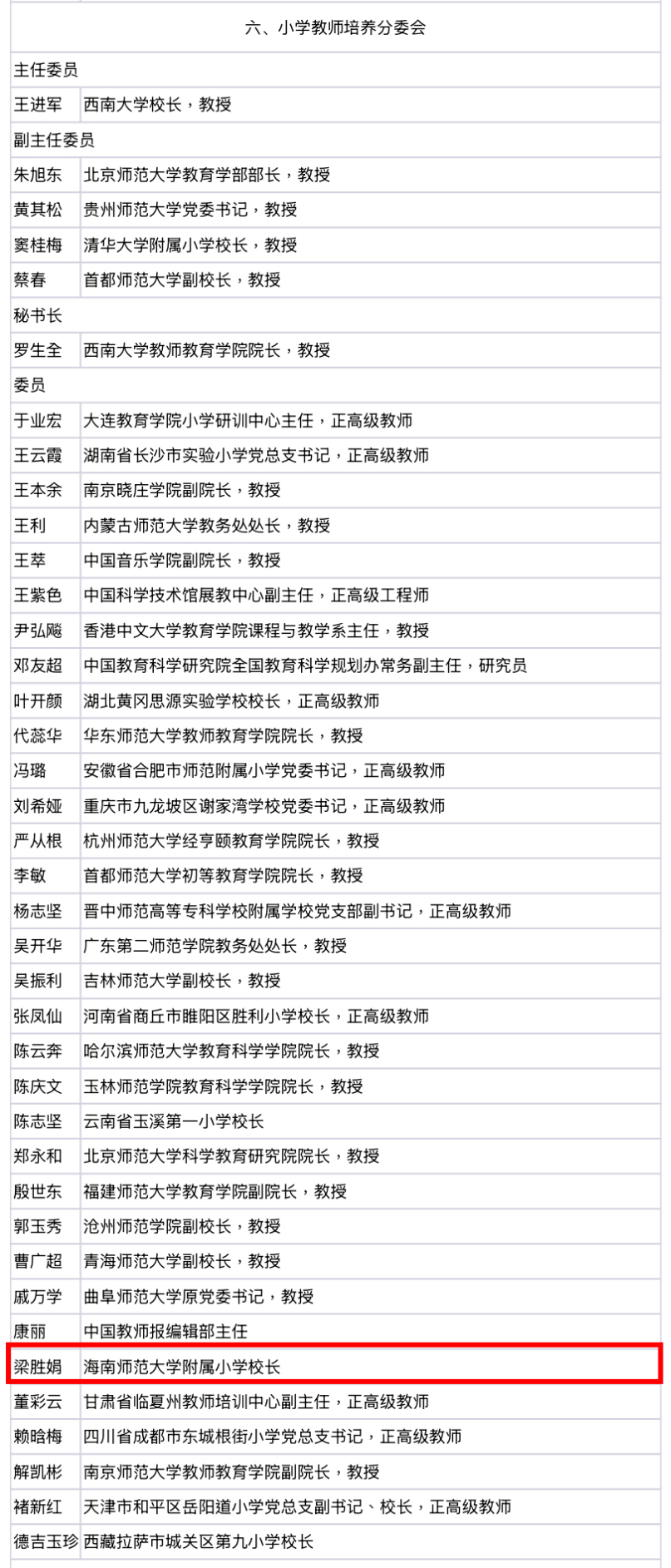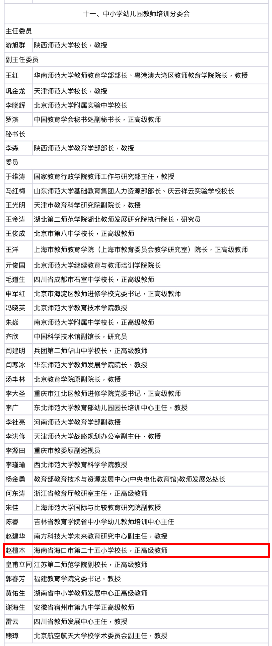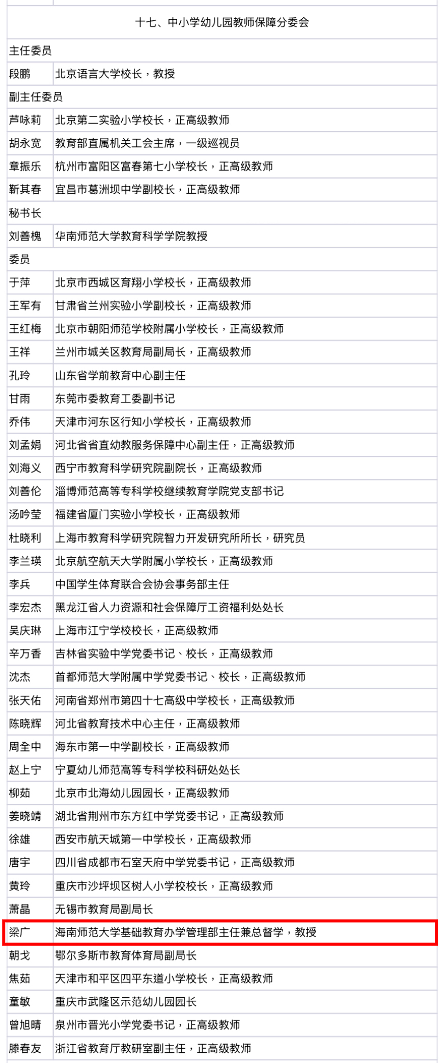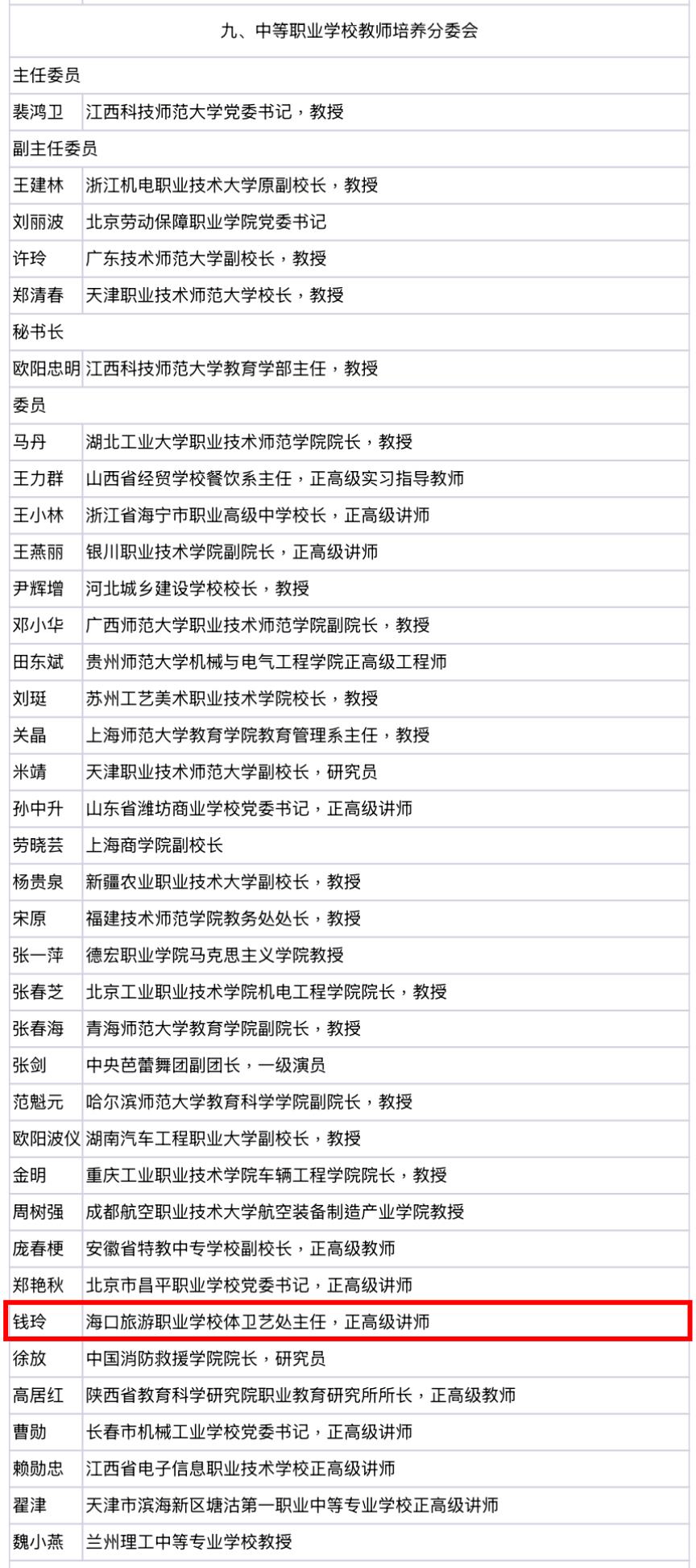 海口旅游职业学校体卫艺处主任钱玲入选中等职业学校教师培养分委会;海南省海口市第二十五小学校长赵檀木入选中小学幼儿园教师培训分委会;海南热带海洋学院院长吕治国入选高校教师管理分委会;海南医科大学现代教育技术中心主任黄斌文入选高校教师保障分委会;海南师范大学基础教育办学管理部主任兼总督学梁广入选中小学幼儿园教师保障分委会。