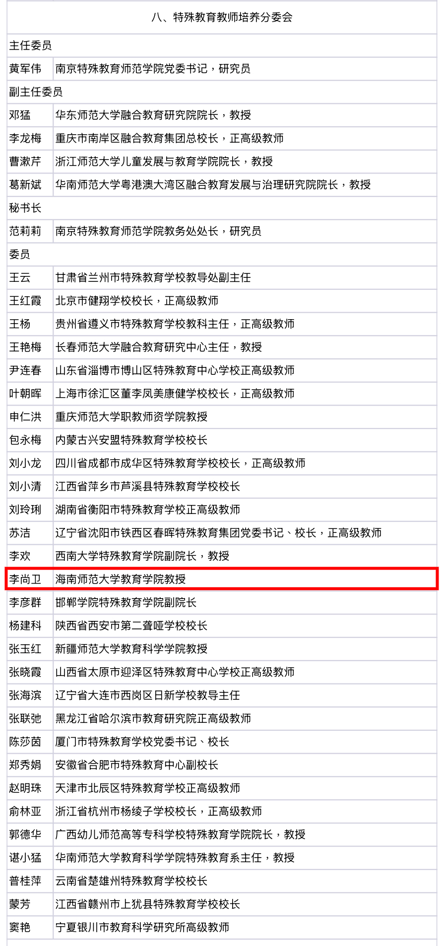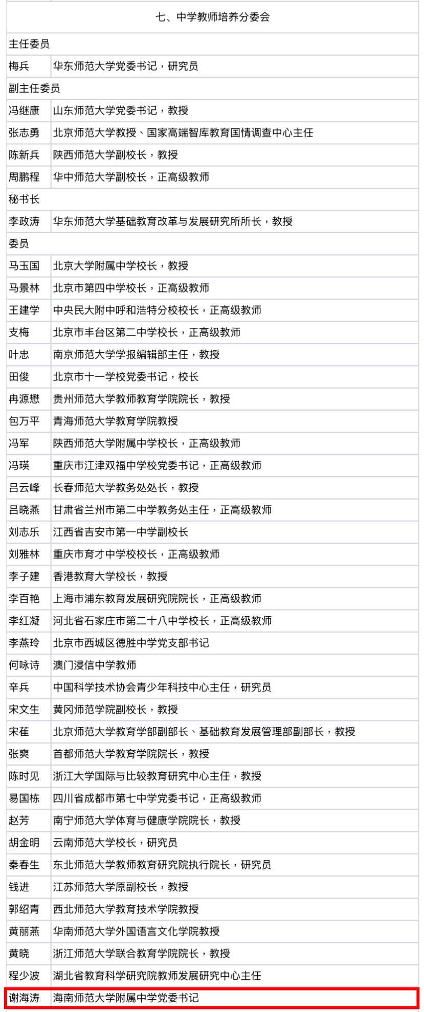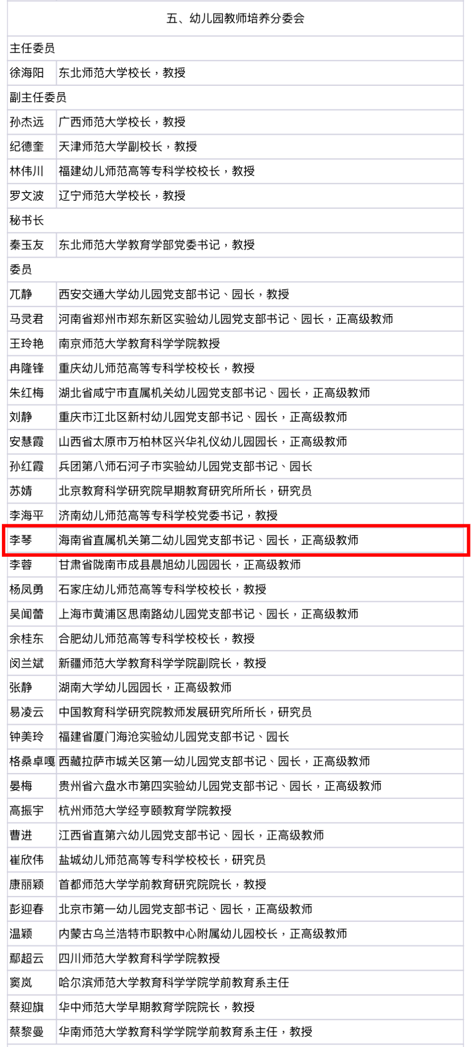 据悉,海南医科大学教务处处长李其富入选职业学校师德师风建设分委会;海南省直属机关第二幼儿园党支部书记、园长李琴入选幼儿园教师培养分委会;海南师范大学附属小学校长梁胜娟入选小学教师培养分委会;海南师范大学附属中学党委书记谢海涛入选中学教师培养分委会;海南师范大学教育学院教教授李尚卫入选特殊教育教师培养分委会。
