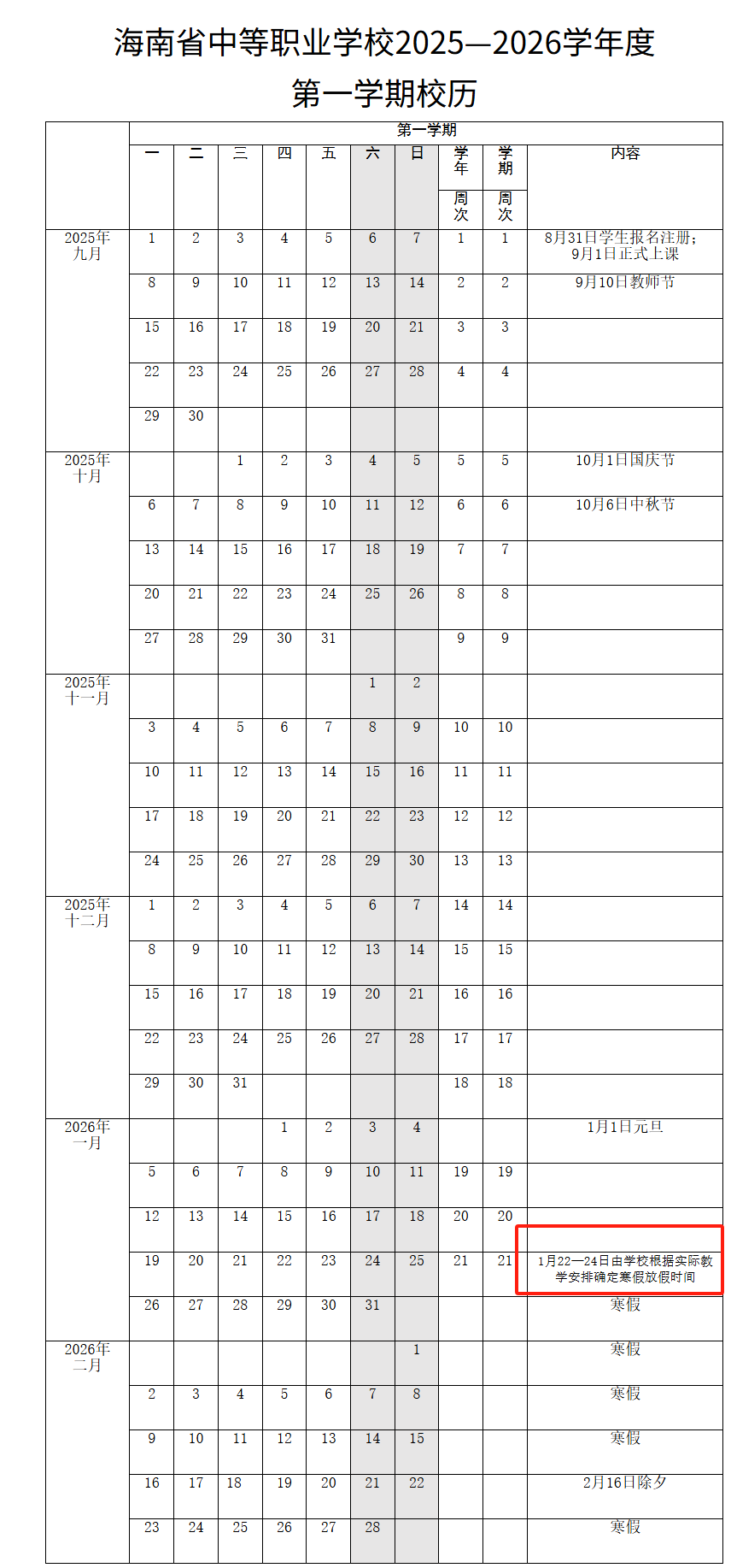中等职业学校校历2025-2026