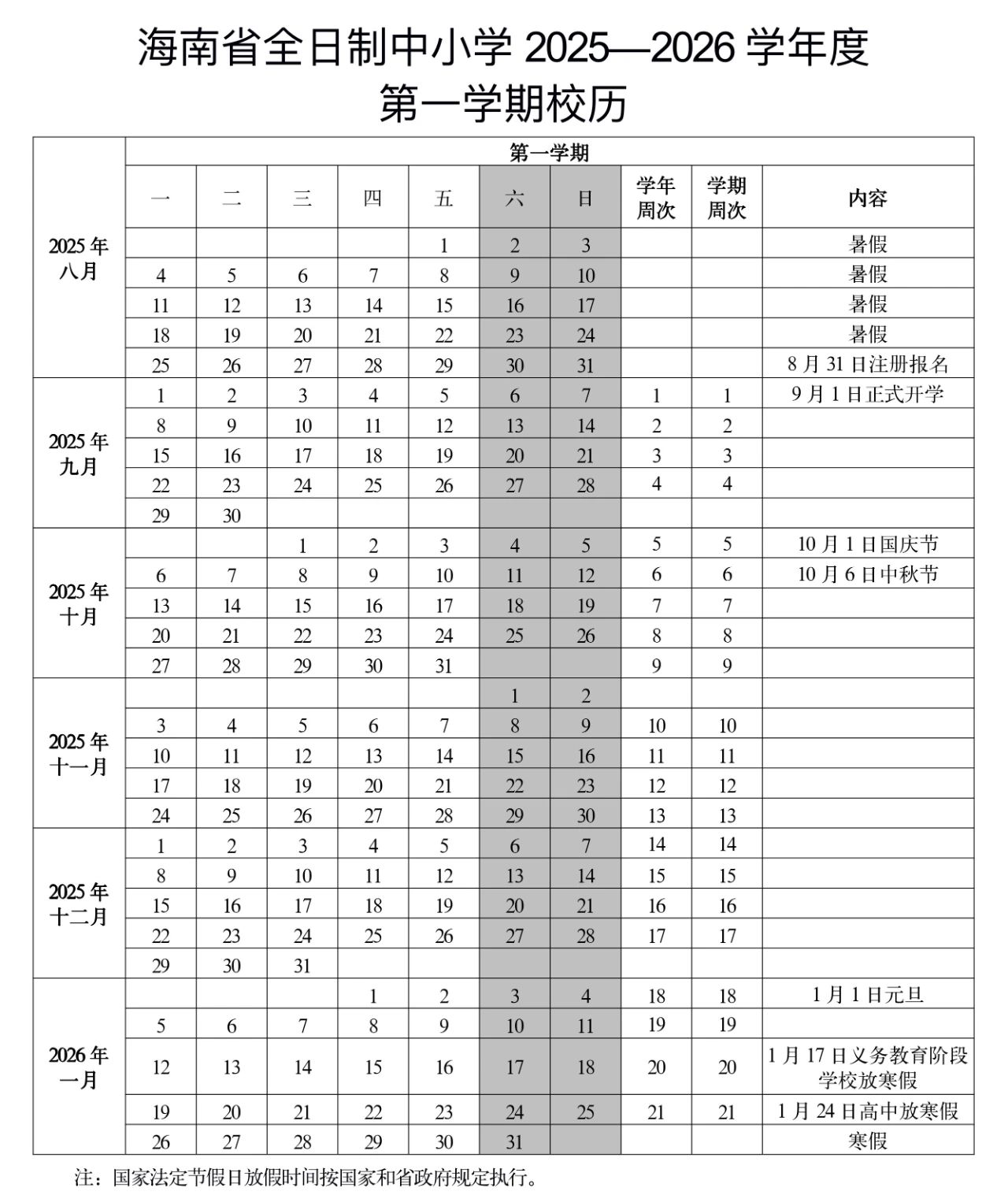 记者从海南省教育厅获悉,根据《海南省全日制中小学2025—2026学年度校历》,海南省义务教育阶段学校2026年1月17日放寒假,7月11日放暑假;普通高中学校2026年1月24日放寒假,7月18日放暑假。