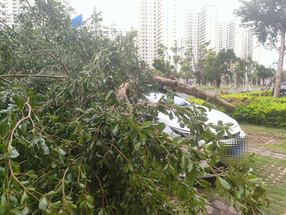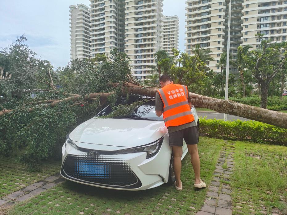 强台风“麦德姆”带来的强风天气给海口市区造成严重影响,多条路段出现树木倒伏、通行受阻。10月6日上午,王先生停放在路边的车辆不幸被倒伏的大树砸中无法移动,焦急之下立即拨打平安产险海南分公司的救援电话。