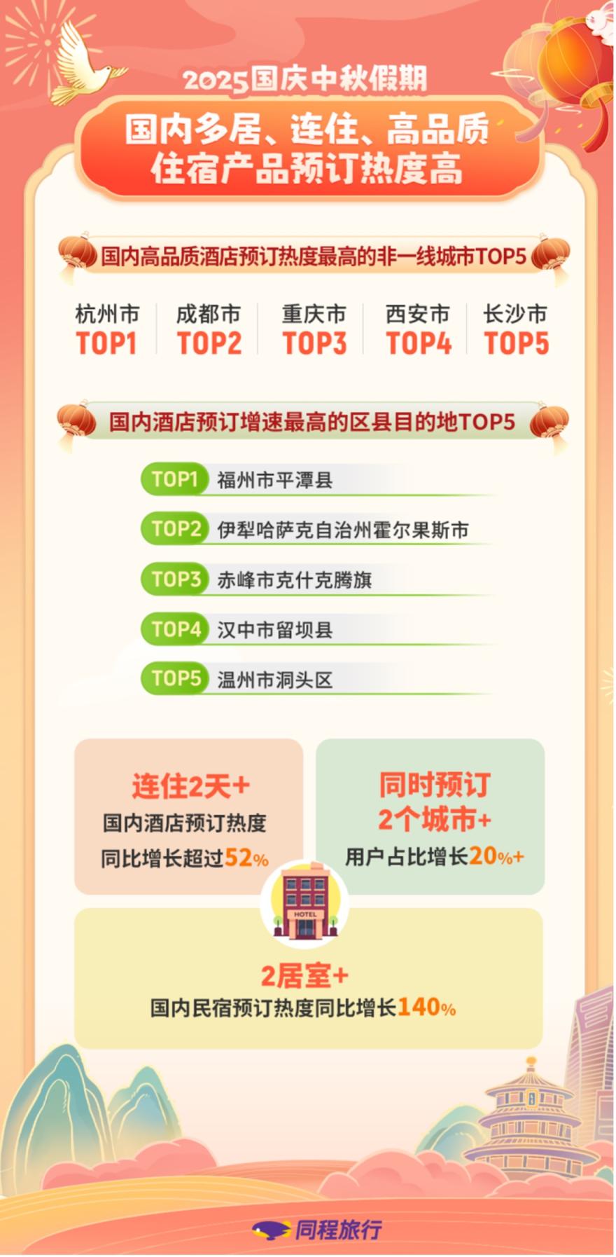 今年国庆中秋假期,国内住宿市场呈现出连住酒店订单增速快、跨城市酒店预订频次高、非一线城市高品质酒店和多居室民宿预订热度高的特征。同程旅行数据显示,今年国庆中秋假期,国内酒店整体预订热度同比增长超过65%,连住2天及以上的国内酒店预订热度同比增长超过52%。8天长假,叠加拼假出行策略,为用户开展高频次的本地周边游,以及横跨多省的长线旅游提供了充裕的时间。假期中,同时预订2个及以上城市的用户占比,同比增长超过20%。