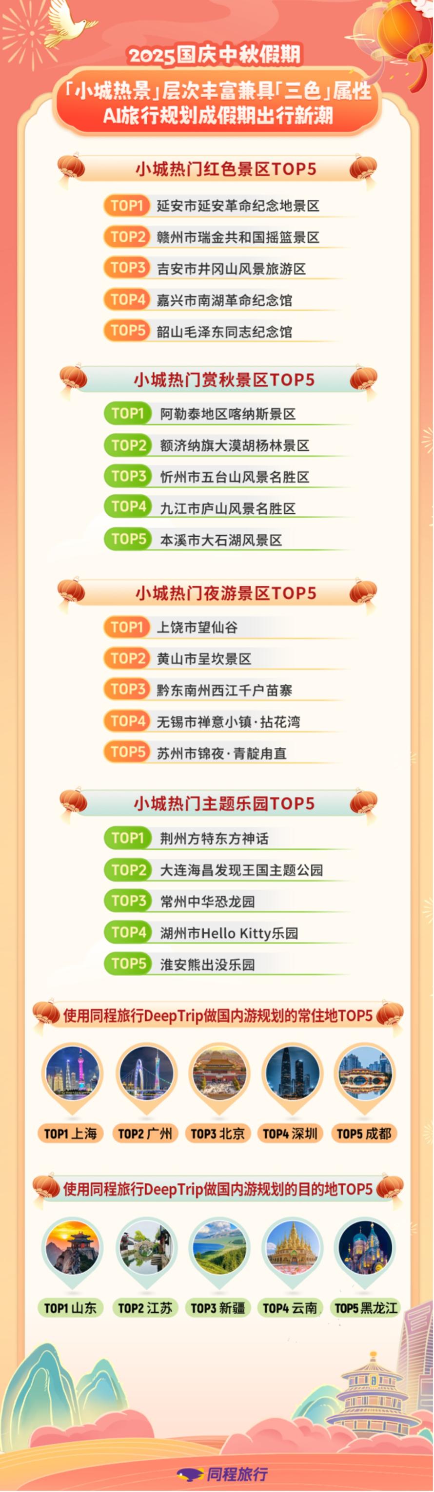 此外,今年国庆中秋假期,越来越多的用户通过OTA平台上的AI工具规划假期出游行程。同程旅行数据显示,国庆中秋假期的国内出游用户中,通过DeepTrip规划国内游行程后实现闭环预订的用户数量相比五一假期也显著增长。其中,常住地为上海、广州、北京、深圳、成都的用户使用DeepTrip进行假期出游规划的频率最高;使用DeepTrip做国内游行程规划最高频的五个目的地省份为:山东、江苏、新疆、云南、黑龙江。
