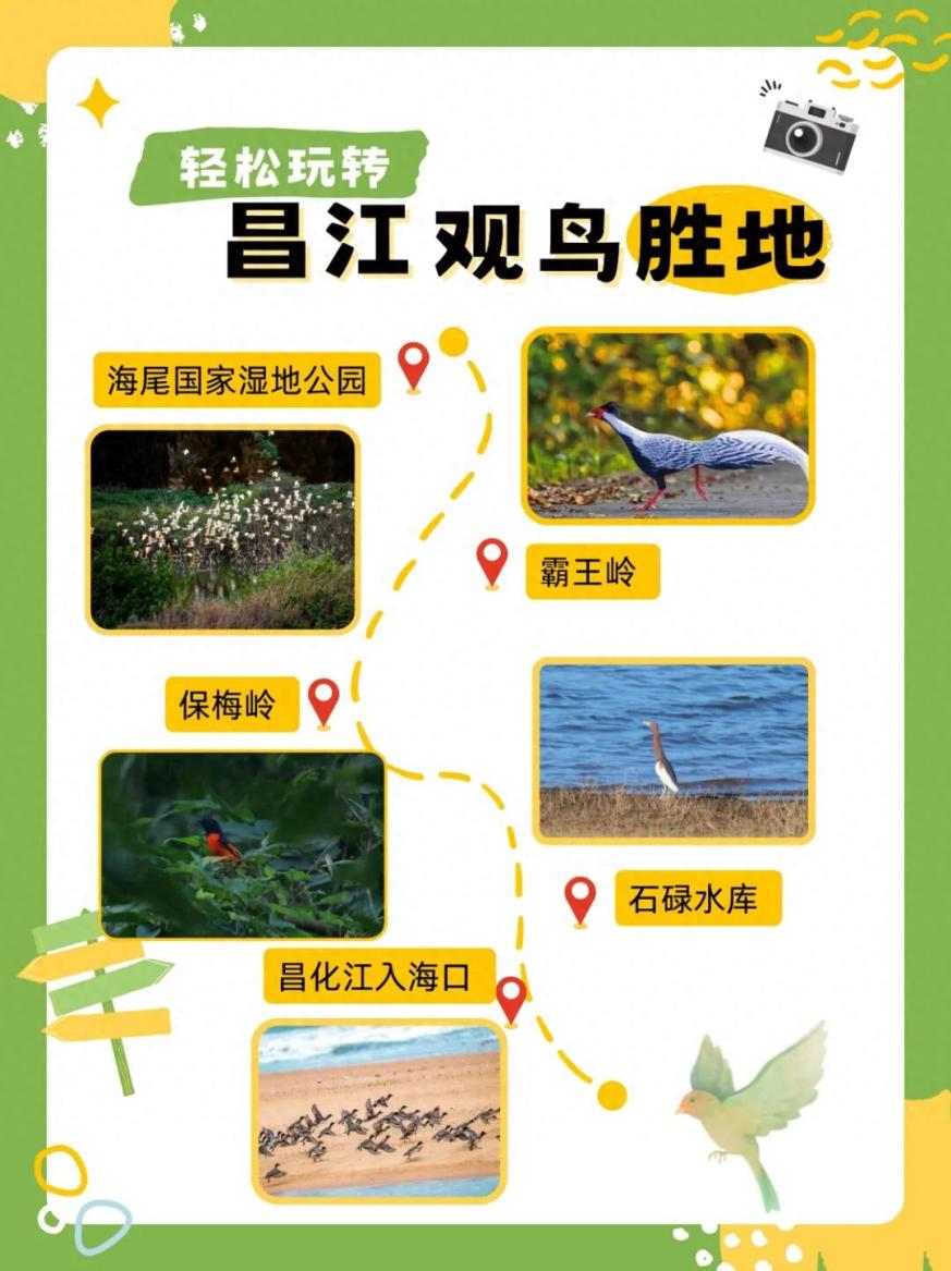 被誉为“海南西部鸟类的天堂”的昌江海尾国家湿地公园是省内罕见的保护较好的滨海内陆淡水沼泽湿地,为各类野生动植物提供了适宜的生存环境。截至目前昌江海尾国家湿地公园记录到的鸟类有213种。彩鹮,黑脸琵鹭,紫水鸡,栗树鸭等一系列珍稀鸟类都在这安家落户,这个被称为海南最佳观鸟胜地之一。