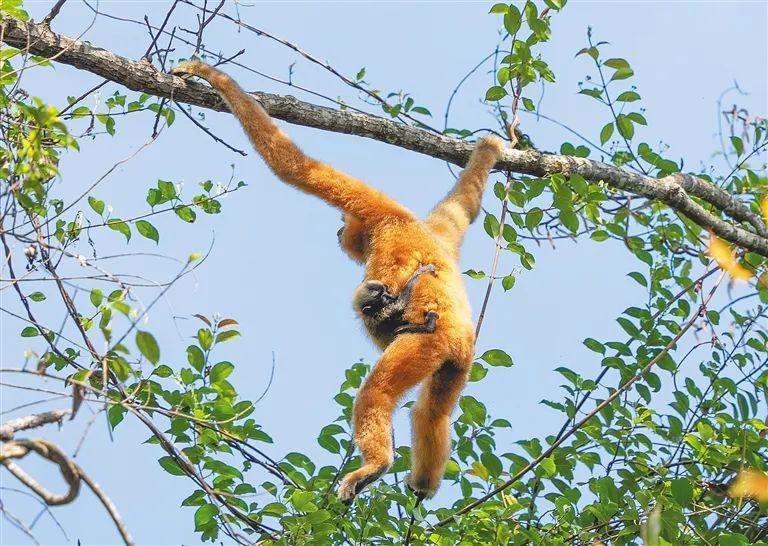 海南长臂猿带着幼崽觅食。海南日报记者李天平摄