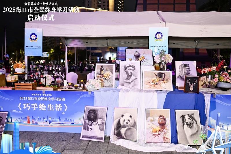 启动仪式后,东坡老码头变身开放式学习空间。互动游戏区人头攒动,市民在趣味挑战中体验学习乐趣,成功参与者均获赠精美纪念品。各主题展区同样热闹非凡:巧手绘生活展区的手工饮料制作吸引了众多爱好者;插花艺术展区、面点烘焙展示区、龙华区与秀英区的社区成果展示区、茶艺鉴赏展示区以及椰雕等非遗技艺展示区前围满了驻足体验和感受的市民。