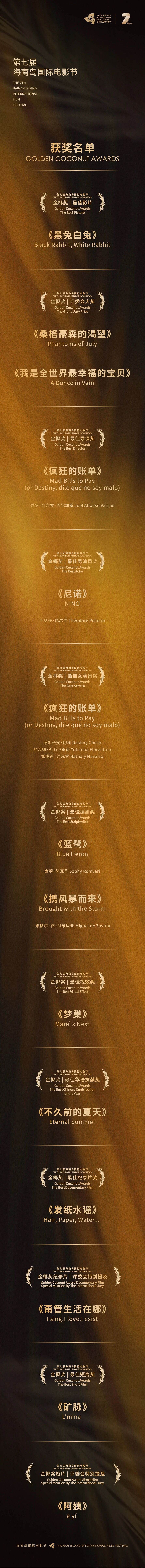作为本届电影节的核心环节,“金椰奖”颁奖典礼备受瞩目。从全球4564部报名影片中脱颖而出的佳作展开激烈角逐,最终各大奖项尘埃落定。《黑兔白兔》获得金椰奖最佳影片,乔尔·阿方索·巴尔加斯凭借《疯狂的账单》斩获金椰奖最佳导演,西奥多·佩尔兰凭借影片《尼诺》获得金椰奖最佳男演员,影片《疯狂的账单》中的三位演员德斯蒂妮·切科、约汉娜·弗洛伦蒂诺、娜塔莉·纳瓦罗共享金椰奖最佳女演员,影片《梦巢》摘得金椰奖最佳视效,《发纸水谣》摘得金椰奖最佳纪录片,《矿脉》摘得金椰奖最佳短片。此外,还有多部优秀影片及电影人分获评委会特别提及殊荣。