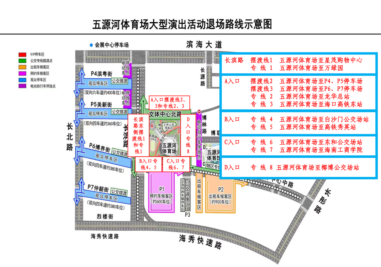 同时,在星茂购物中心开通3条免费公交摆渡线:星茂购物中心至五源河体育场公交站、P4、P5停车场至五源河体育场A入口、P6、P7停车场至五源河体育场A入口;投放24辆公交车,直达五源河体育场,观演群众可就近停车,摆渡前往。同时海口公交还将储备12辆公交应急运力,全力确保群众出行需求。