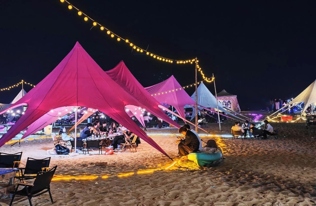 荣山寮村的跨年电子音乐派对营造出独特的海滨氛围,吸引众多年轻潮人。假期期间,这里皮划艇、桨板等水上项目备受青睐,岸边咖啡厅、海鲜排档与糟粕醋火锅座无虚席,围炉煮茶、啤酒烧烤等休闲方式同样受欢迎。当地民宿预订火爆,漂浮的人民宿主理人表示:“假期基本处于满房状态。”