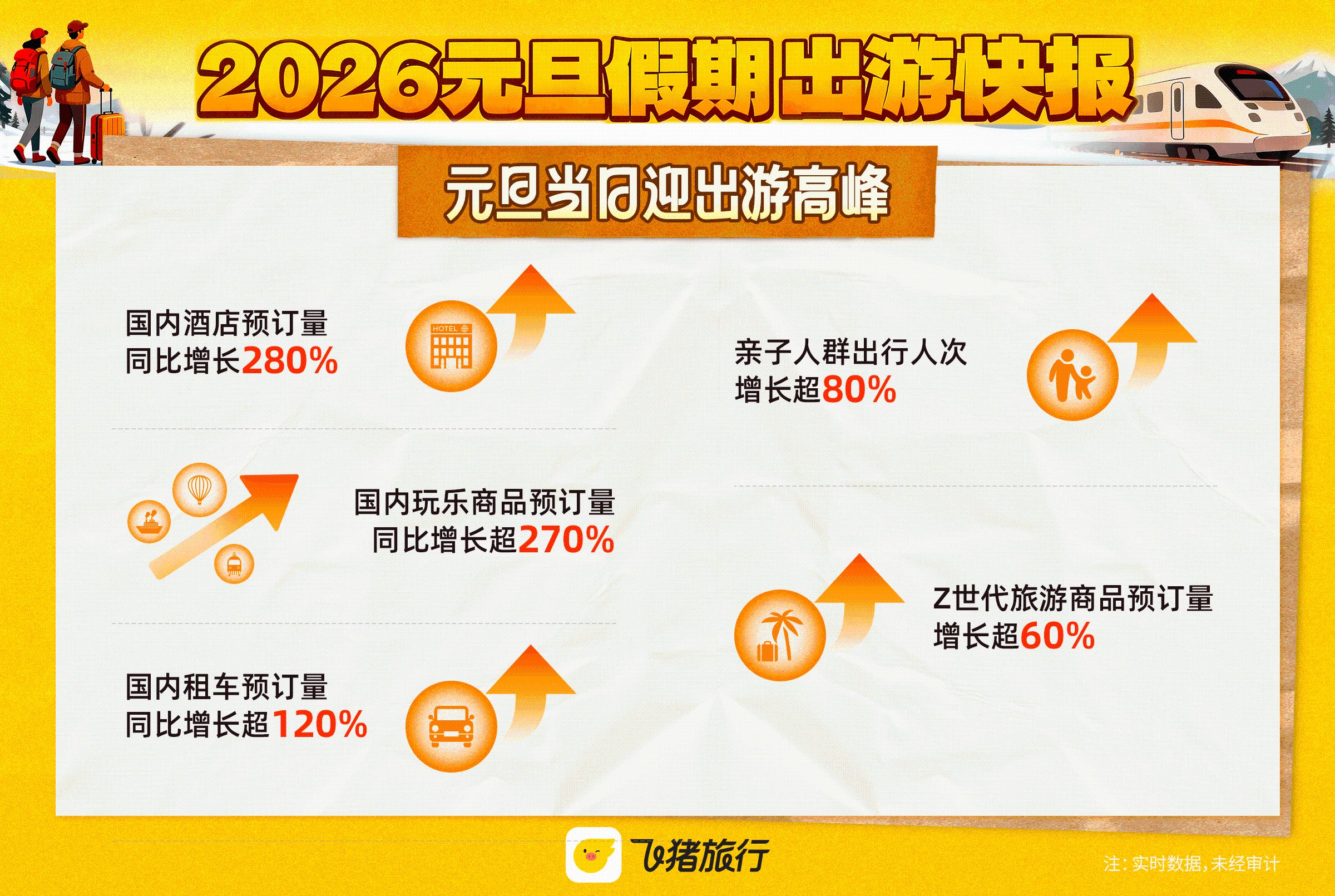 受“请3休8”拼假攻略的强力驱动,2026年元旦旅游市场火热开局。1月3日,飞猪发布的《2026元旦假期出游快报》显示,消费者出游意愿与消费力双双提升:人均购买件数同比增长超20%、人均消费金额同比增长超30%。1月1日元旦当天,飞猪国内酒店预订量同比劲增280%,国内目的地玩乐商品预订量同比增长超270%。