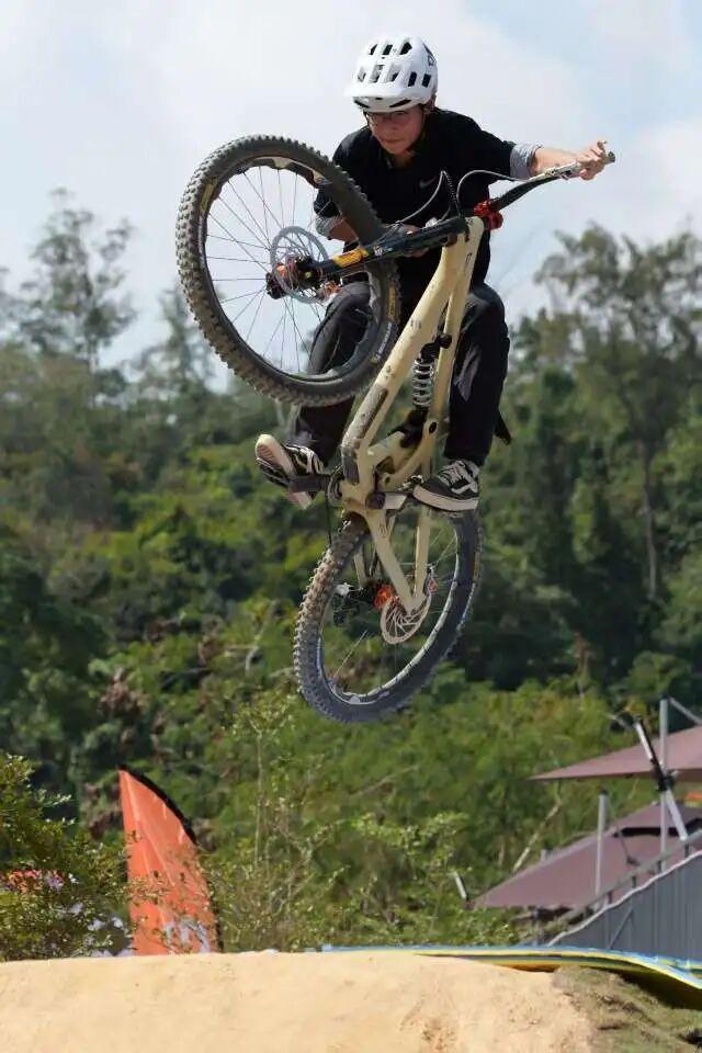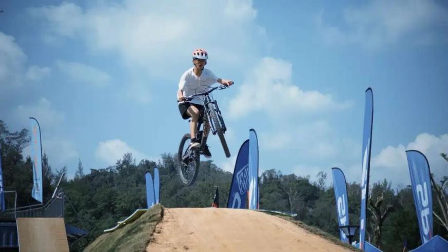 车龄26年的山地攀爬车手,世界吉尼斯自行车跳高纪录保持者,目前全网有800万粉丝的自行车界大牛张京坤也来到开业现场展示车技并与慕名而来的骑行爱好者们亲切互动,交流车技,他非常看好万宁的骑行等户外和水上运动。