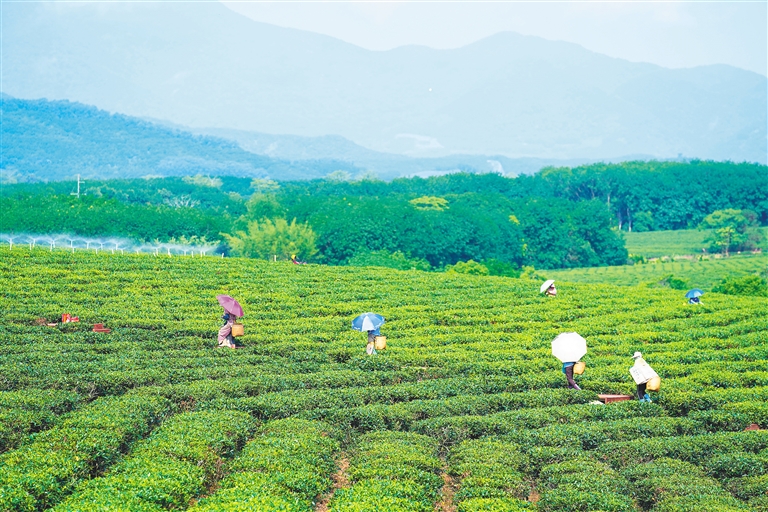 资料图:白沙黎族自治县原生态茶园小镇,茶农在采摘茶叶。