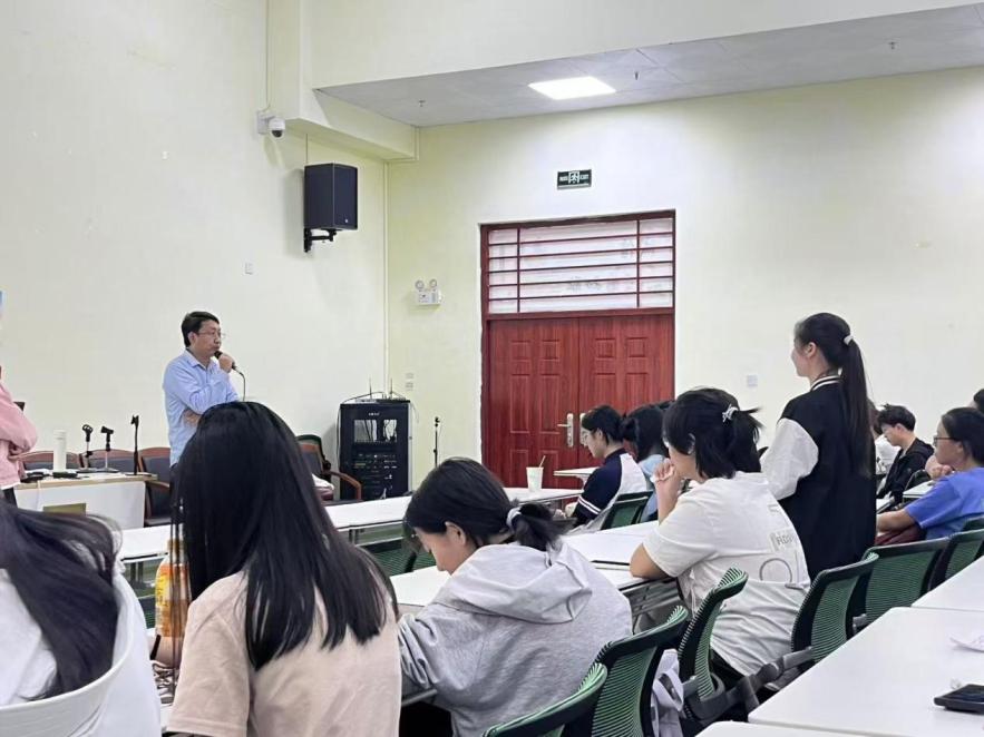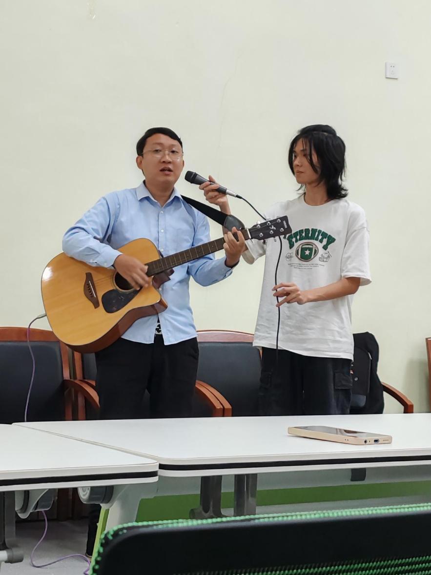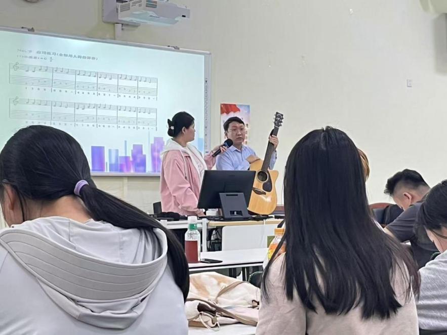 在讲解吉他基本原理时,何昌老师用通俗易懂的语言,向同学们详细介绍了吉他的构造、演奏技巧以及音乐理论知识,还现场演示了不同的演奏姿势和指法,让同学们对吉他有了更为直观的认识。