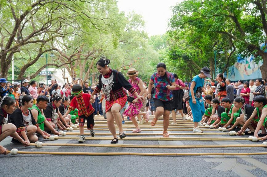 海南“三月三”活动期间,群众在五指山市跳竹竿舞。新华社发