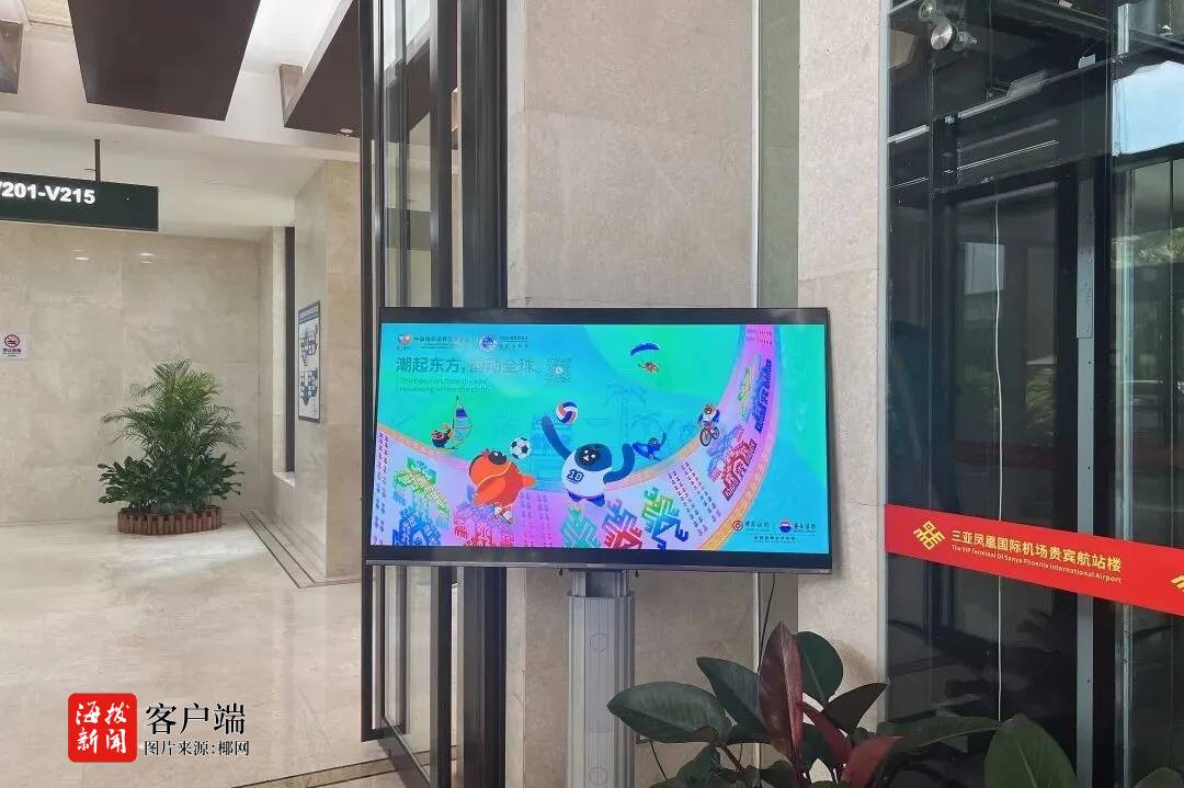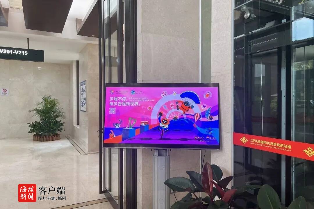 琼海博鳌机场于候机楼内值机、安检通道、旅客休息区等多个点位电子屏投放消博会主视觉画面,展海岛热烈风情,点“靓”盛会氛围。