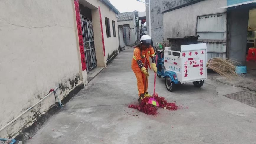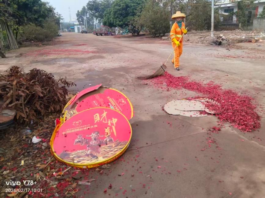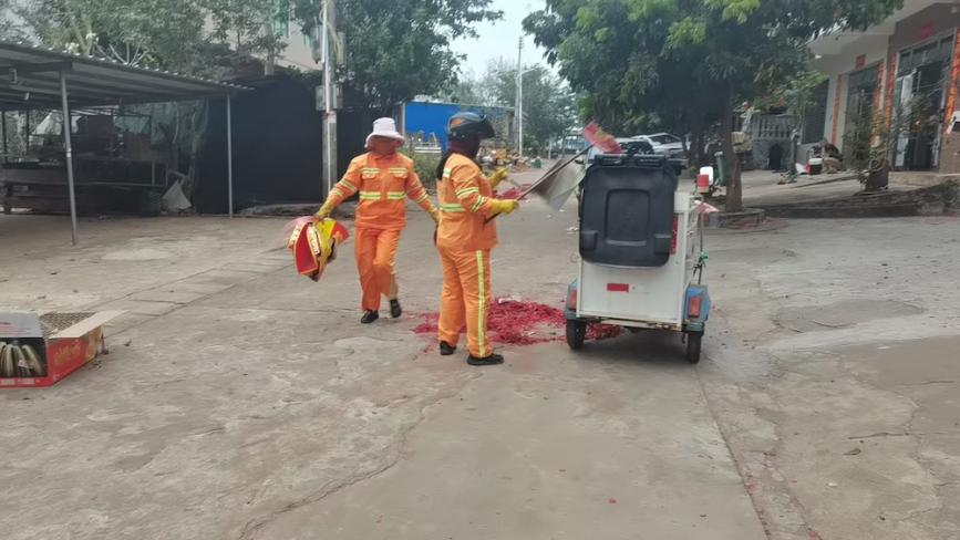 洋浦环卫工人一大清早立即投入到清理鞭炮纸屑垃圾工作之中