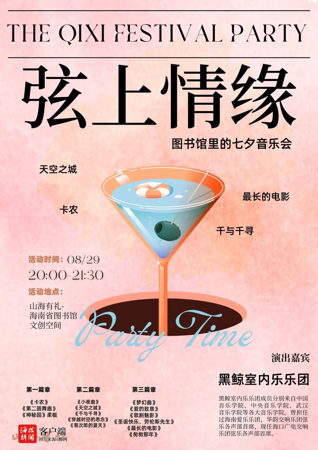 同日,“弦上情缘”图书馆里的七夕音乐会也将于山海有礼-海南省图书馆文创空间优雅奏响。黑鲸室内乐乐团将演绎多首经典曲目,在书香与琴韵交织的氛围中,为观众带来一场高雅而又温暖的心灵抚慰。