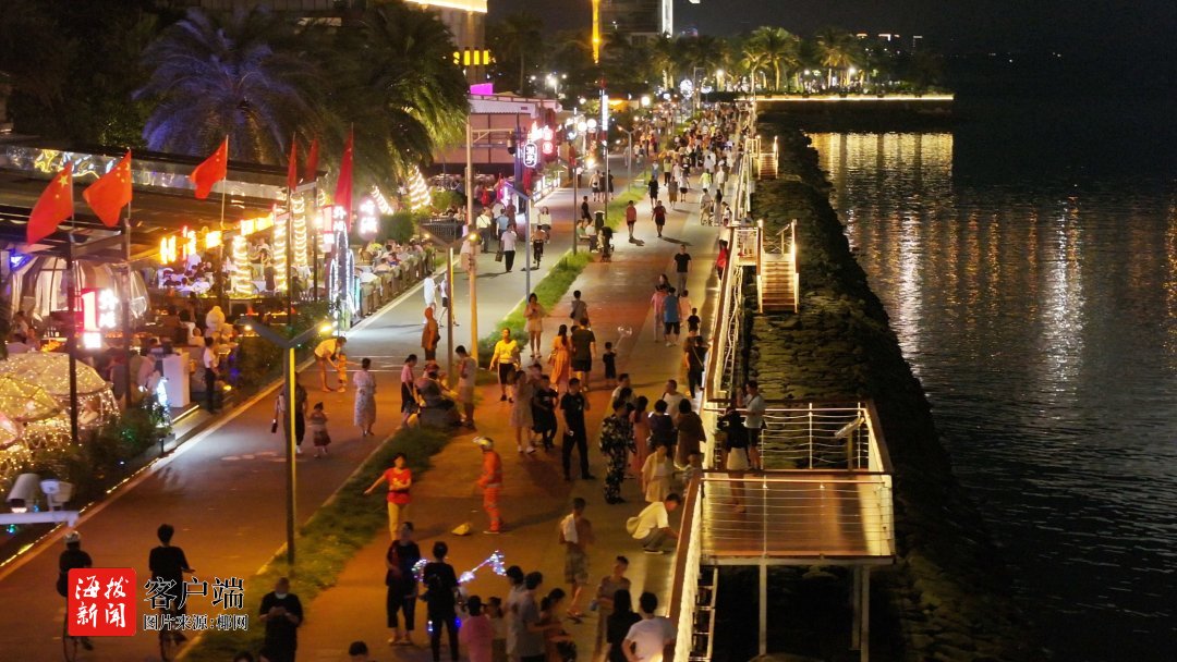 傍晚时分,海口湾逐渐热闹起来。人们面向大海静待漫天霞光映照海面。随着暮色渐深,不少市民游客选择走进海边餐厅,于浪漫氛围中享用晚餐,开启属于海口之夜的惬意时光。