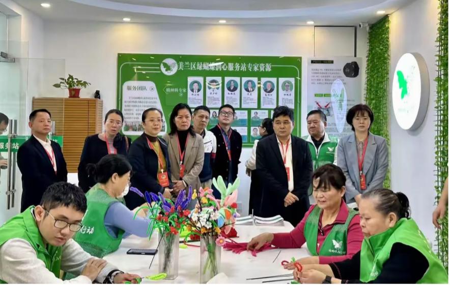 随后,视察组前往美兰区绿蝴蝶“润心”服务站,调研省级民生实事点位的创新服务模式。工作人员现场讲解“AI科技+人文”“职业训练+社会融入”的首创服务体系,展示信息化管理平台运行、精神障碍患者康复训练及就业帮扶等成效。委员们与服务站负责人深入交流,了解到该站通过嵌入式服务,将康复训练、就业指导精准送到群众身边,有效解决了特殊群体的实际困难。