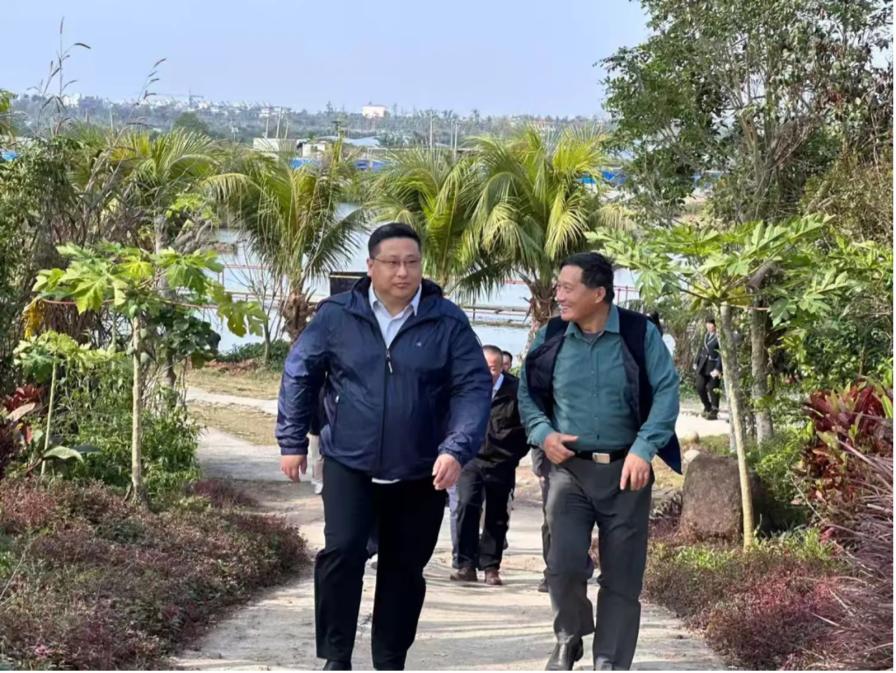 随后,调研组前往演丰枷椗山现代农业养殖基地,实地考察生态循环农业模式运行成效及农文旅融合发展的创新实践。在听取区政协委员、海南椰梦生态文化产业投资有限公司董事长张贵生关于基地规划建设、生态效益与经济效益协同推进等情况汇报后,调研组,充分肯定企业立足咸淡水资源禀赋、探索工厂化循环水养殖新路径的积极探索。调研组强调,枷椗山养殖基地紧邻东寨港红树林保护区,要严守生态底线、推进尾水治理达标排放;立足特色资源,发挥技术优势,将生态优势转化为发展胜势,走好可持续发展之路;各相关职能部门需靠前服务强化政策保障,依托“美兰好品”实施双轮驱动,提升产品附加值。