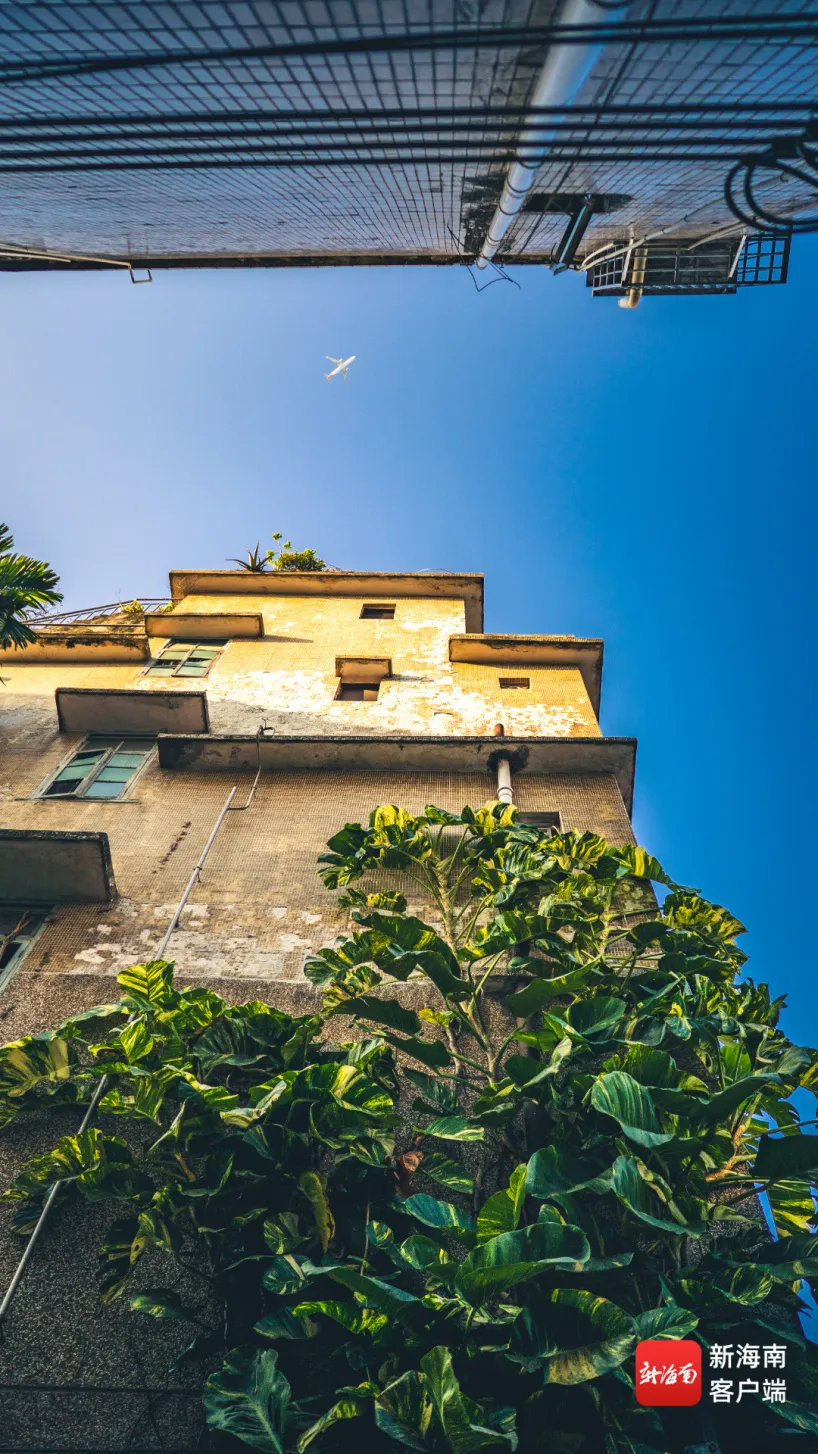 海口滨海新村社区里,向上攀爬生长的植物与天空中的飞机同框。记者刘孙谋摄