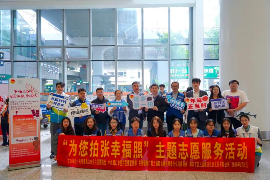 当春运返乡客流与亚洲杯赛事热情在海口美兰国际机场交汇,一场特别的青春志愿服务也如期而至。2月3日,美兰国际机场T2航站楼内,由共青团海口市美兰区委员会联合中共海口市美兰区委宣传部、中共海口市美兰区委人才局、共青团海口美兰国际机场有限责任公司委员会、海口市美兰区旅游投资发展有限公司主办的“年味正当时,为您拍张幸福照”主题志愿服务活动正式启动。活动融合节日氛围与体育赛事热点,为旅客及返乡大学生送上一份“抵达礼”。