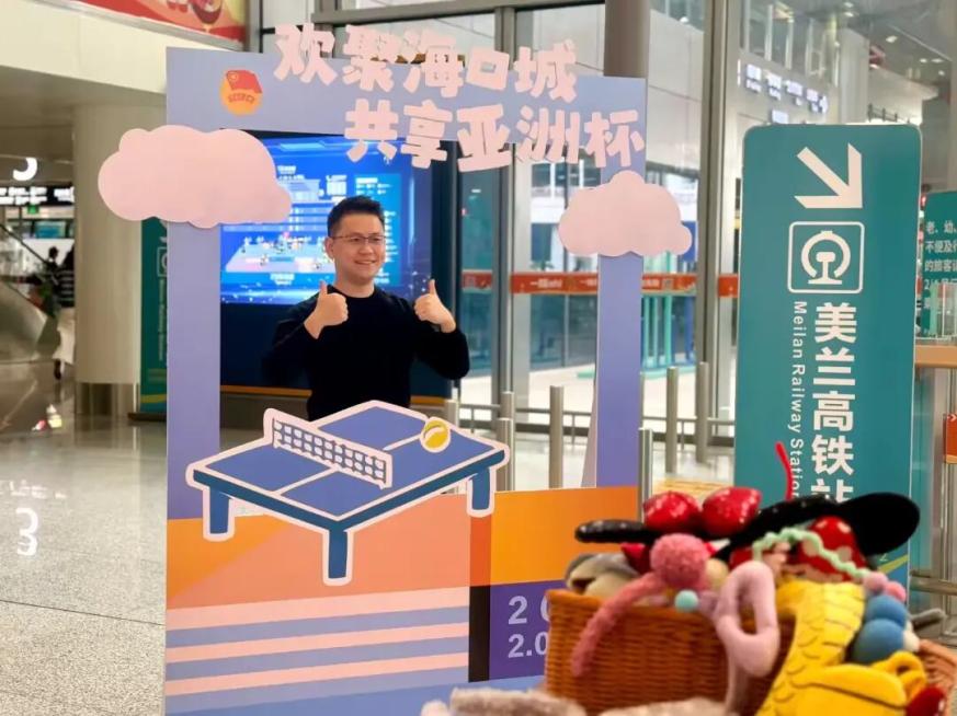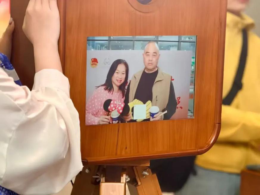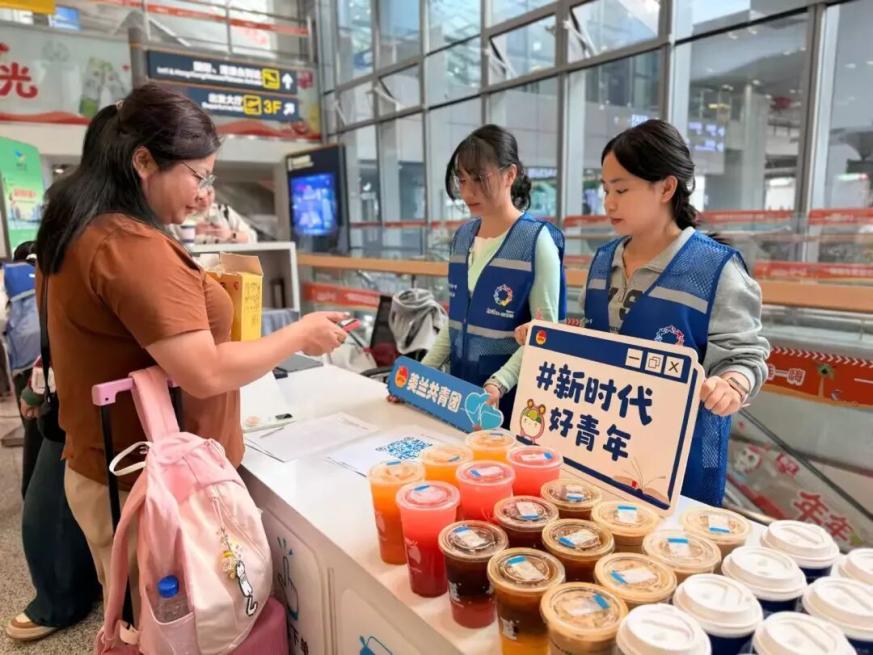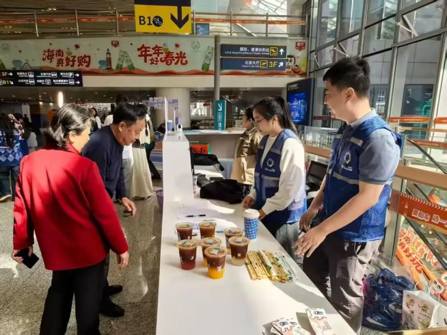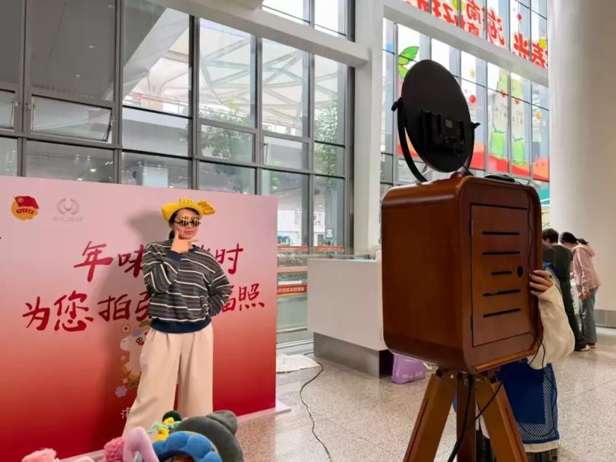 活动现场设置了主题拍照区,融入了亚洲杯乒乓球赛事元素的特色相框,吸引众多旅客驻足。青年志愿者与专业摄影师一道,为旅客免费拍摄“幸福照”,实现照片现场打印、即拍即得。活动还特别提供了由瑞幸咖啡支持的“暖心饮品”。