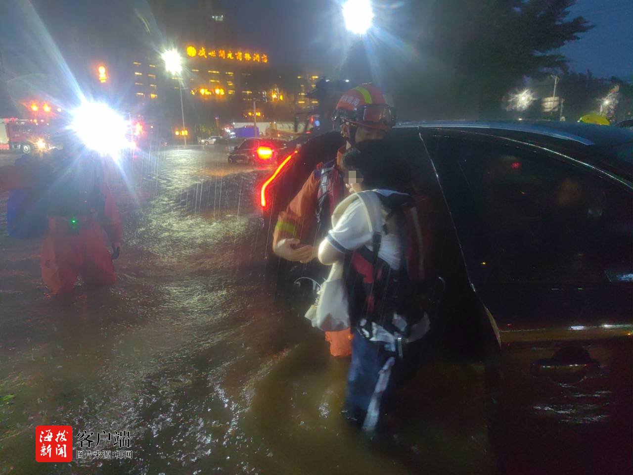 消防救援人员到达现场后看到暴雨导致路口低洼处道路积水严重,水位已没过膝盖位置且在不断上涨,一车辆因水浸被困在积水道路中间,车内两名人员被困,由于不了解水深情况,不敢贸然下车。了解情况后,消防员立即穿戴水域救援装备,并用救援绳索进行安全保护,涉水前往被淹车辆,靠近车辆后为被困人员穿戴浮力背心,并先后将两名被困人员救出,转移到安全区域。