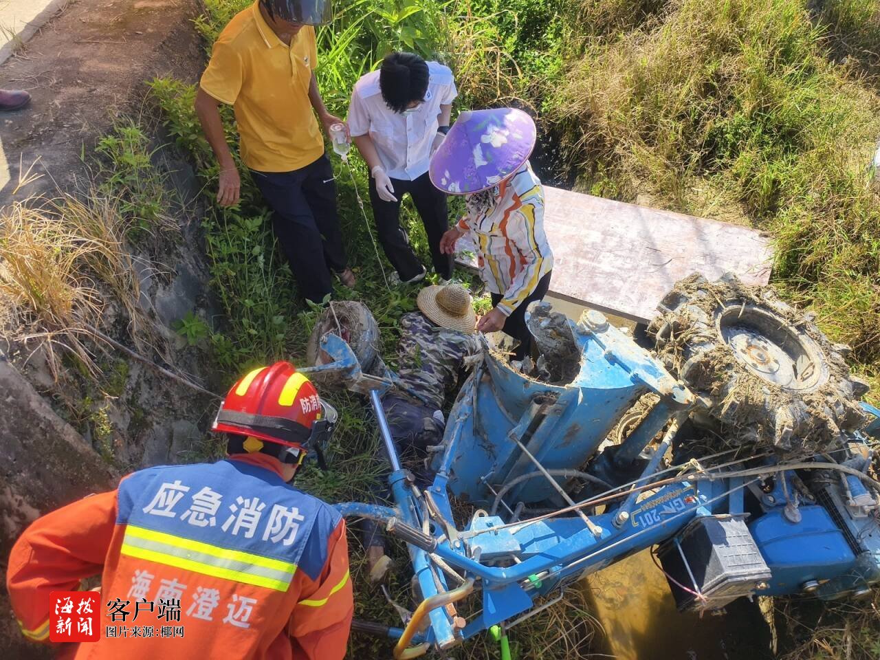 8月5日9时02分,澄迈县金安农场三多村路口一农用耕田机在路面行驶过程中“失足”侧翻,驾驶员受伤被困车内无法脱身。接到报警后,金江消防救援站迅速抵达现场处置。