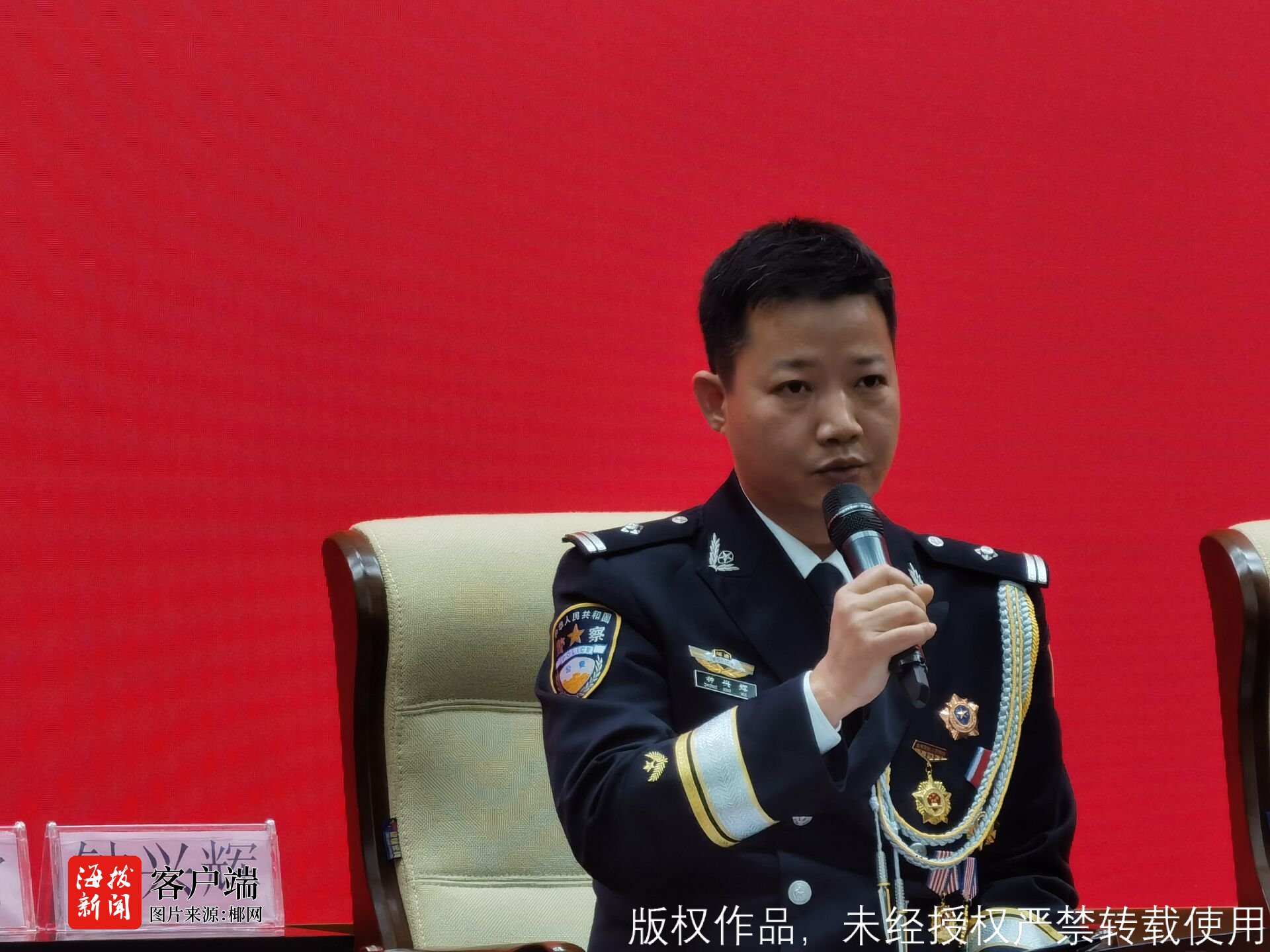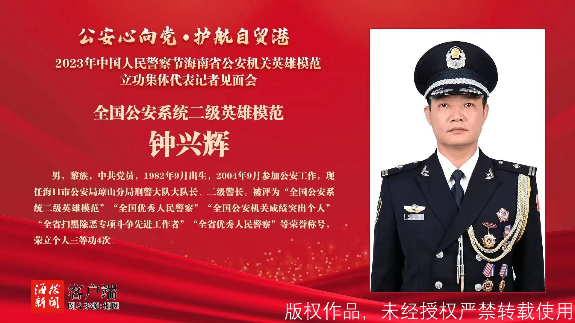 1月9日,中共海南省委宣传部举行“公安心向党护航自贸港”——2023年中国人民警察节海南省公安机关英雄模范立功集体代表记者见面会。会上,海口市公安局琼山分局刑警大队大队长钟兴辉分享了自己的工作事迹。