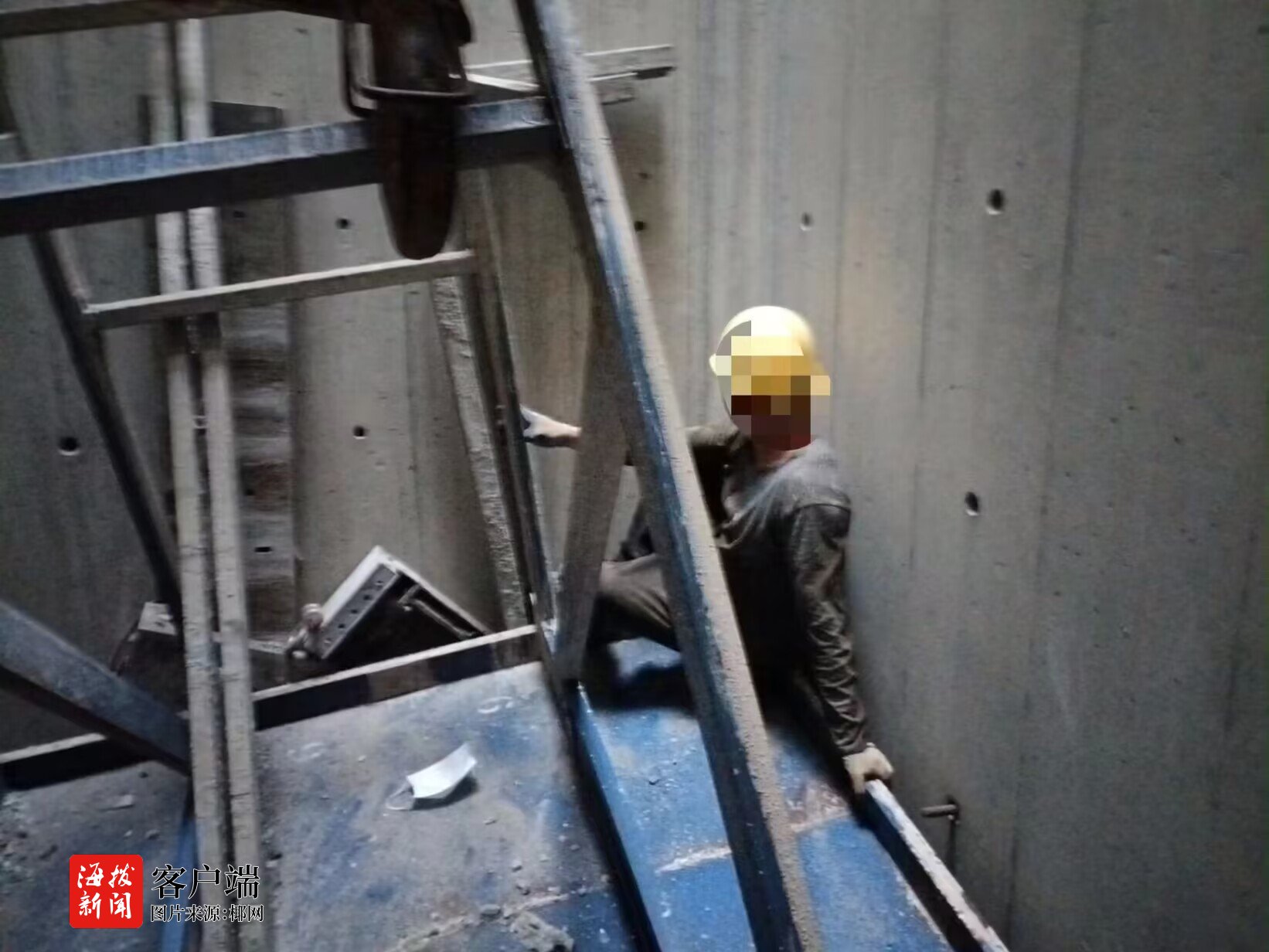2月22日晚,在海口市美兰区碧海大道附近某住宅小区在建工地上,一名工人在电梯井内第13层作业时不慎摔倒,导致工作平台上负重不均发生倾斜,其左脚紧紧卡在平台与电梯井内壁之间,受伤状况不明。更危险的是,他的身上尚未做好安全保护措施,平台上方虽有塔吊钢丝悬挂,但下方无任何支撑部件,竖井13层,一旦平台倾角过大,后果不堪设想!