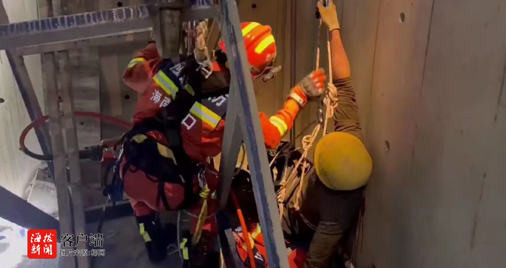 事发后,海口市美兰区消防救援大队海甸消防救援站火速赶往现场。情况紧急,消防救援人员迅速确定救援方案。经过研判,考虑到平台倾角时刻变化的隐患,救援人员先对工人进行绳索保护,再利用破拆工具组开辟上方救援通道。