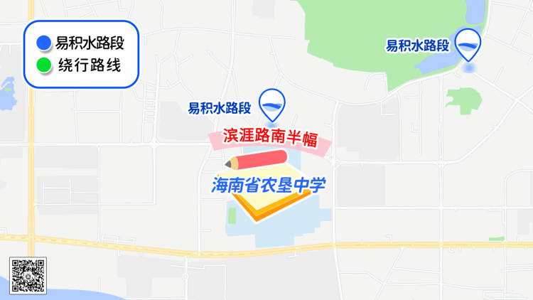 1.雨天以下路段易出现短时积水:(1)滨涯路海南省农垦中学路段;(2)金垦路金地路口。