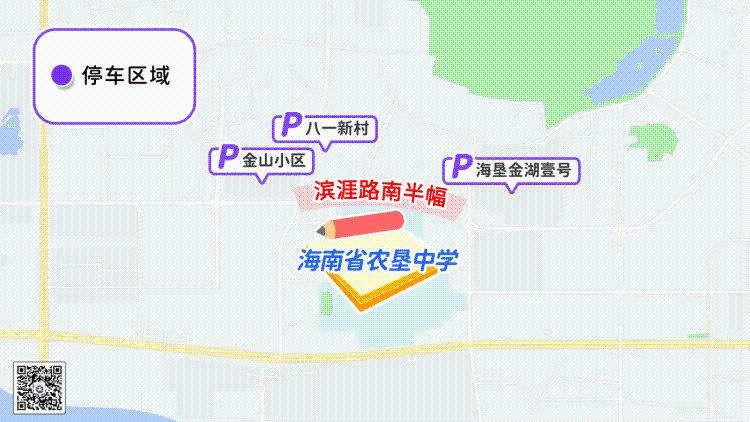送考车辆请有序停放在海垦金湖壹号、八一新村、金山小区等考点周边停车场,以免扎堆停放造成拥堵。