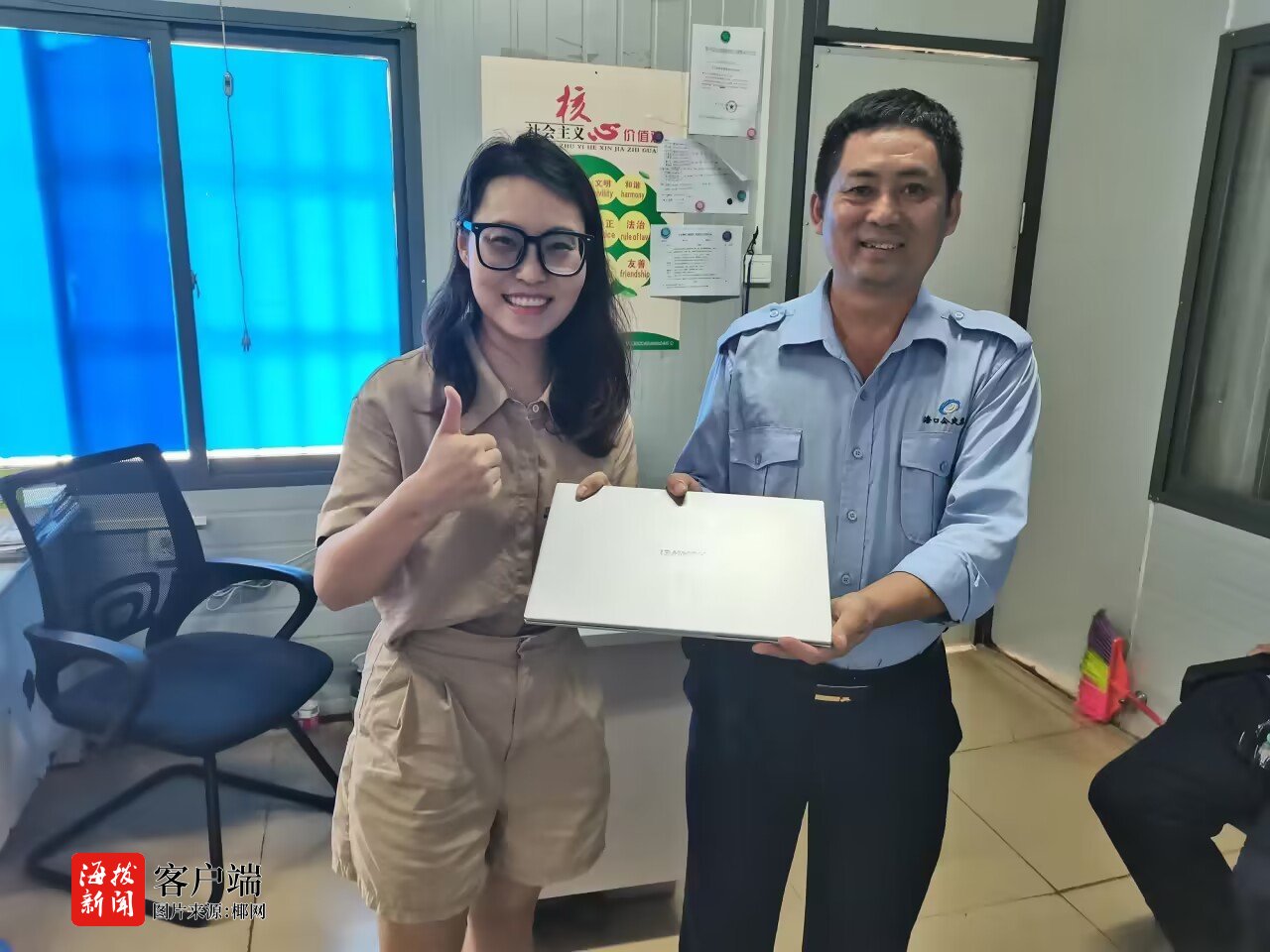 6月29日上午,市民宋女士来到海口公交集团公交三分公司大学城调度室,认领丢失的笔记本电脑。接过笔记本电脑,她激动地说:“感谢工作人员的热心帮助,让我失而复得笔记本电脑。”