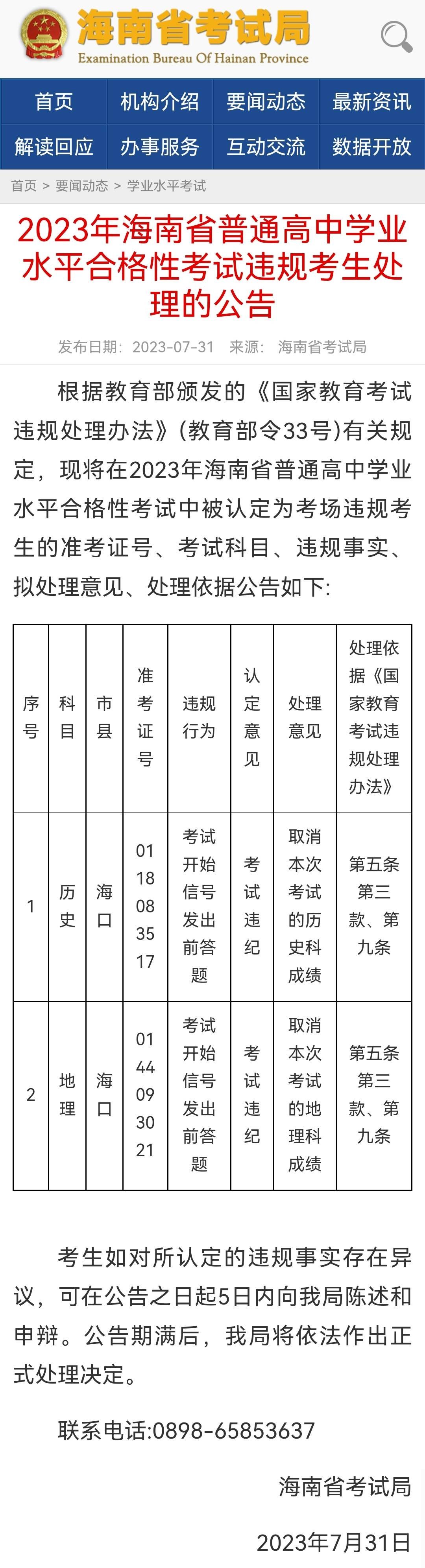 7月31日,海南省考试局发布《2023年海南省普通高中学业水平合格性考试违规考生处理的公告》(以下简称:《公告》),海口两名考生分别在历史、地理科目考试时被认定为考场违规,做出取消该科目考试成绩处理。