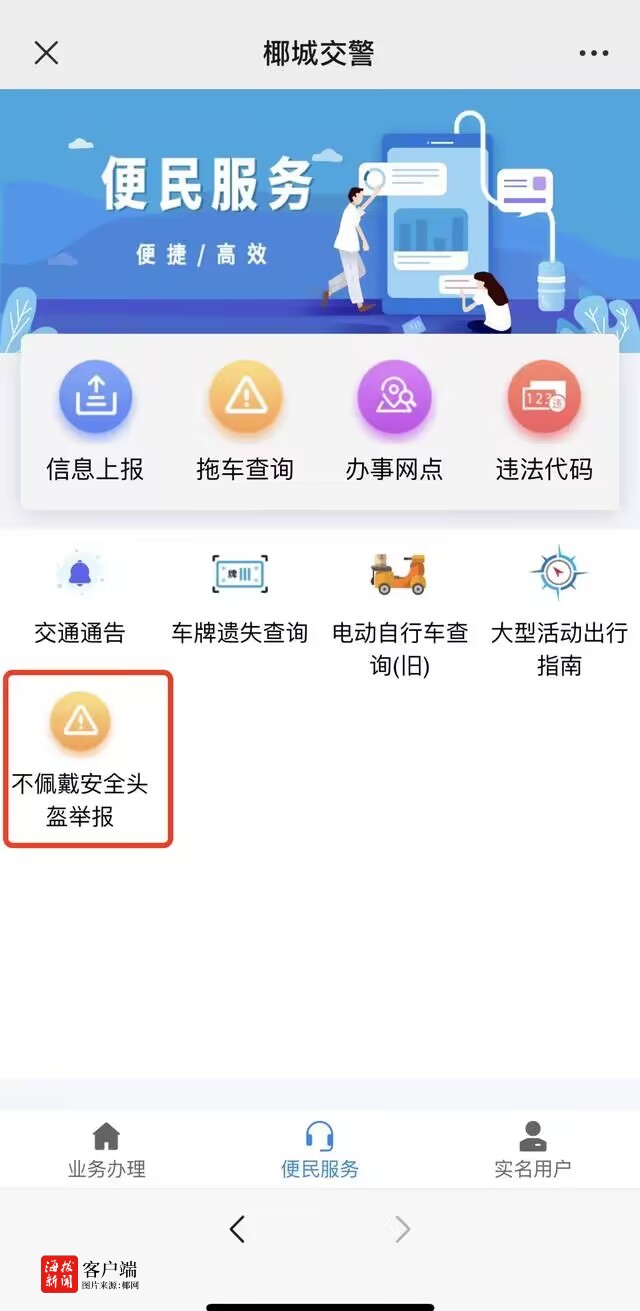 此外,在此次交通安全守护“亮盔行动”中,海口公安交警部门同步启用了随手拍“不佩戴安全头盔举报”平台,市民通过关注“椰城交警”微信公众号即可使用,充分借助科技手段让交通安全守护“亮盔行动”深入海口大街小巷,做到发现一起,教育一起,警示一片,努力促使交通参与者实现自我教育、自我管理,从根本上提高广大人民群众参与交通、约束自我的自觉性,增强安全意识,杜绝不佩戴头盔、未悬挂号牌上路行驶、闯红灯等交通违法行为。