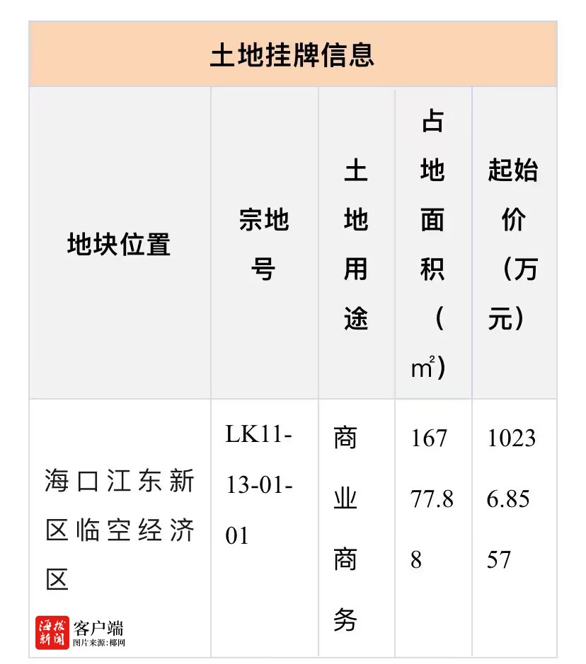 10月9日,海口市自然资源和规划局发布土地挂牌公告,将出让位于海口江东新区临空经济区的一宗地块。本次挂牌出让的地块占地面积约1.68万平方米(25.17亩),土地用途为商业商务混合用地,起始总价约为1.02亿元。