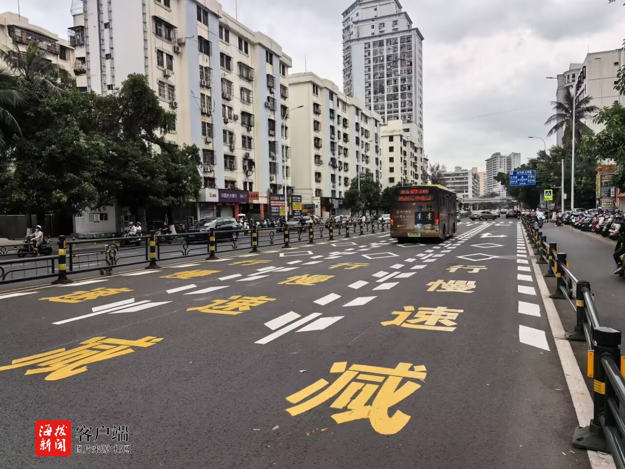 当日上午11时,记者来到龙华路椰树集团路段看到,改造后斑马线前约100米的车道路面上增设纵向减速标线,以及“减速慢行”的字样和菱形图案标识,斑马线前标有“礼让行人”的横向标识。人行横道标志牌也有所变化,改造后的黄绿色边框十分显眼。