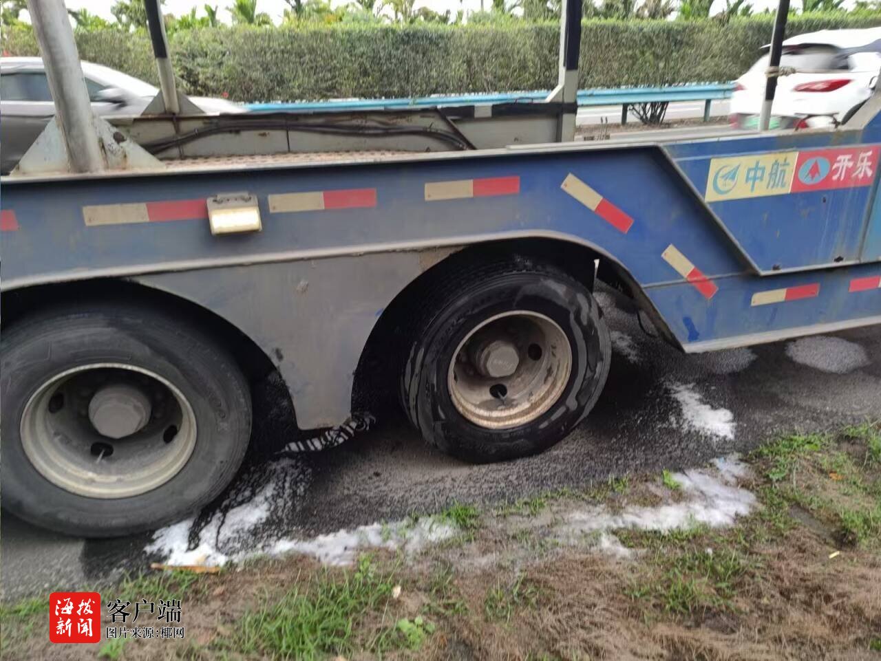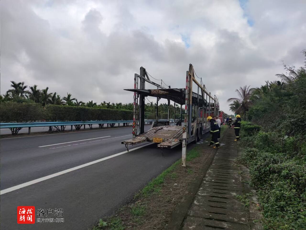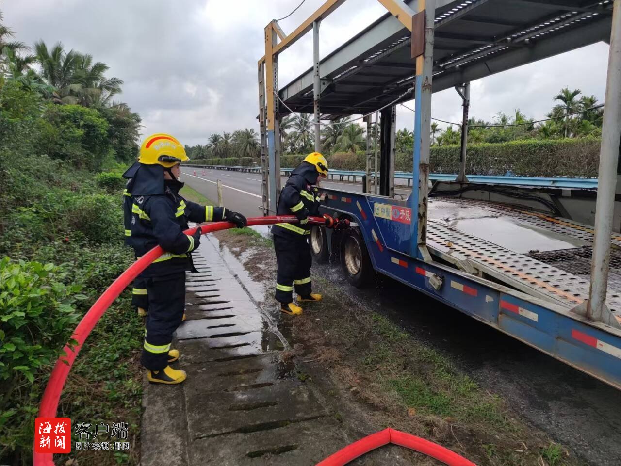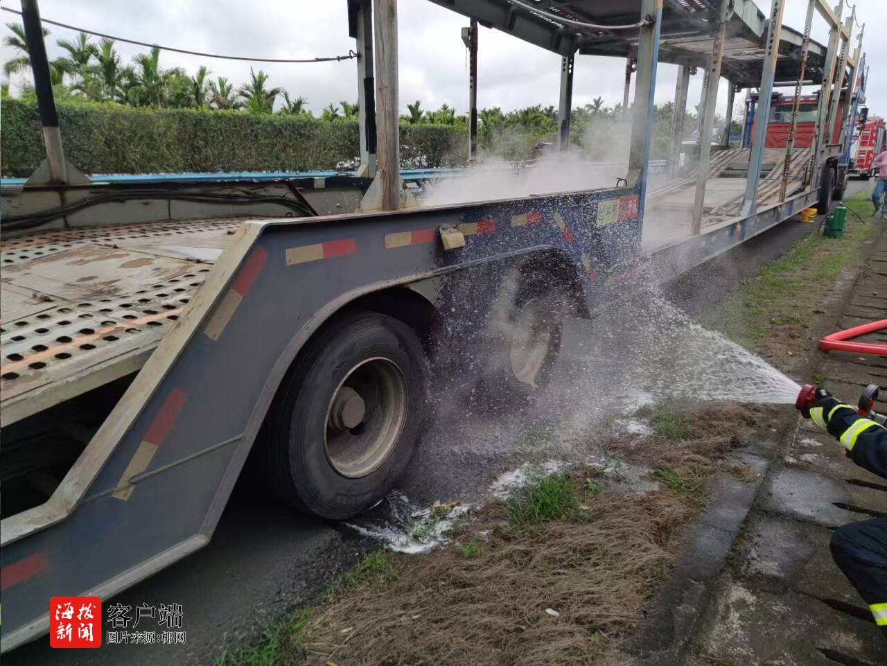 2月16日上午9时许,东线高速三亚往海口方向琼海路段一辆大型拖车行驶过程中轮胎发生起火。接到报警后,琼海市消防救援支队指挥中心立即调派4车24人迅速前往现场处置。