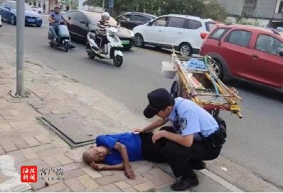 据了解,4月13日18时许,海棠分局藤桥派出所巡逻队员蓝朝帝、李昱徽在结束“护校安园”工作返回派出所的途中,接到群众求助称在藤桥迅发加油站路口处,有一名老人不知什么原因躺在路边。