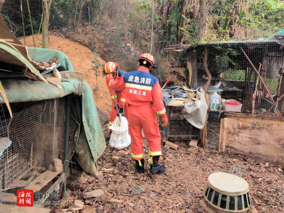据了解,4月17日下午,吉阳区网枝村村民到鸡舍巡查时发现一条蟒蛇,且该蟒蛇已捕食了一只鸡。由于蟒蛇体积较大,村民不敢上前捕捉,于是拨打电话向消防部门求助。三亚消防指挥中心接警后立即调派鹿回头消防救援站消防救援人员赶赴现场处置。