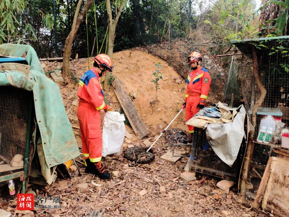 4月17日,三亚市吉阳区网枝村一村民在鸡舍发现一条长约2米、重约40斤的蟒蛇,发现时该蟒蛇已捕食了一只鸡,遂报警。三亚消防赶赴现场将其捕获,目前已将蟒蛇移交至动物保护协会进行处理。