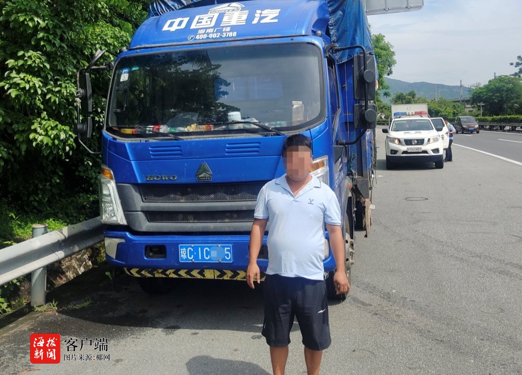 据了解,6月25日10时37分,三亚交警高速公路管理大队执勤队员巡逻至G98环岛高速公路267公里处路段时,发现一辆琼C1C**5轻型仓栅式货车停在了应急车道上,车辆双闪未开启,后方也没有摆放危险警示标志,交警执勤队员见状立即上前了解情况。